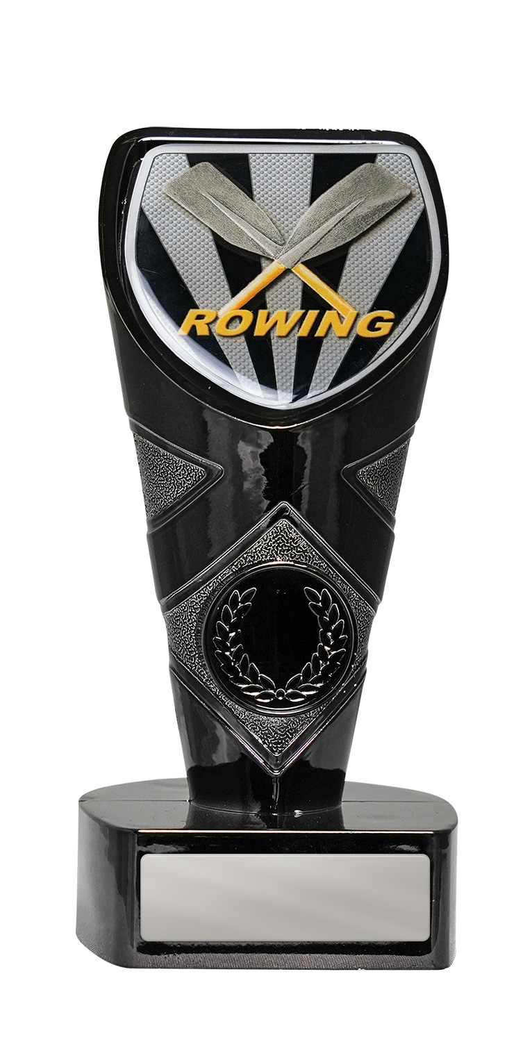 Showcasing a striking shield shaped design, this rowing trophy stands out with its bold black and silver palette. It features crossed oars and the word 'Rowing' for a clear, professional finish. It offers a memorable way to recognise achievement in rowing events and club competitions.
