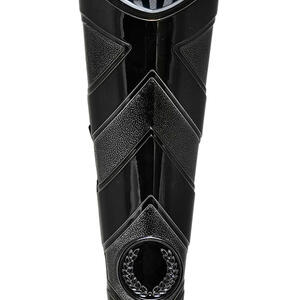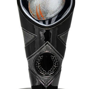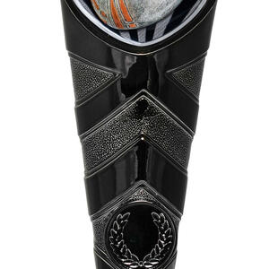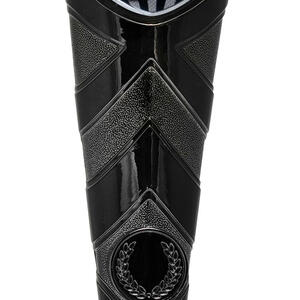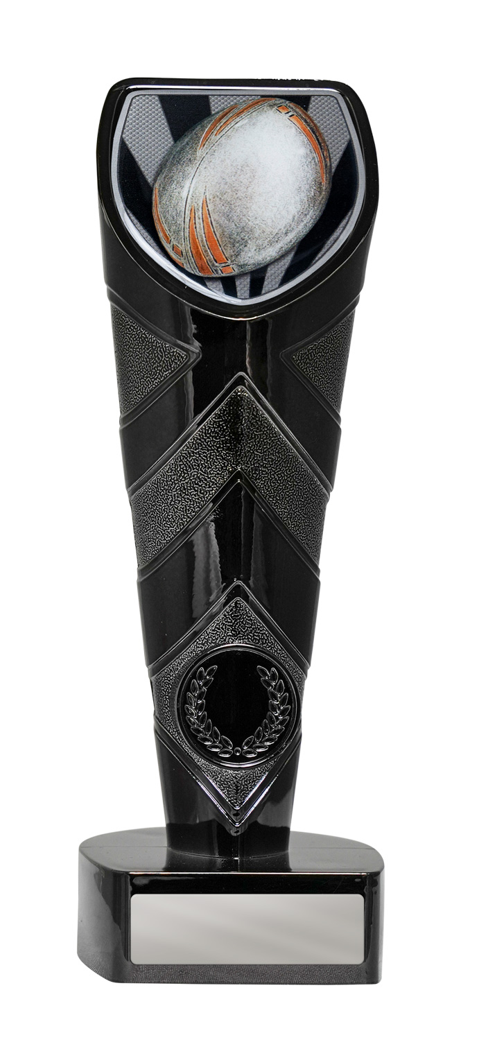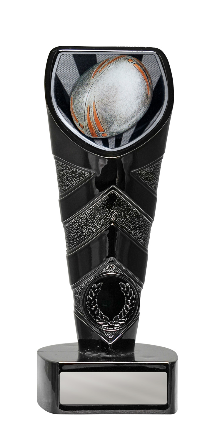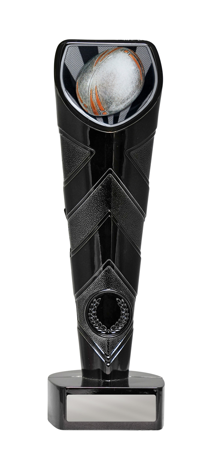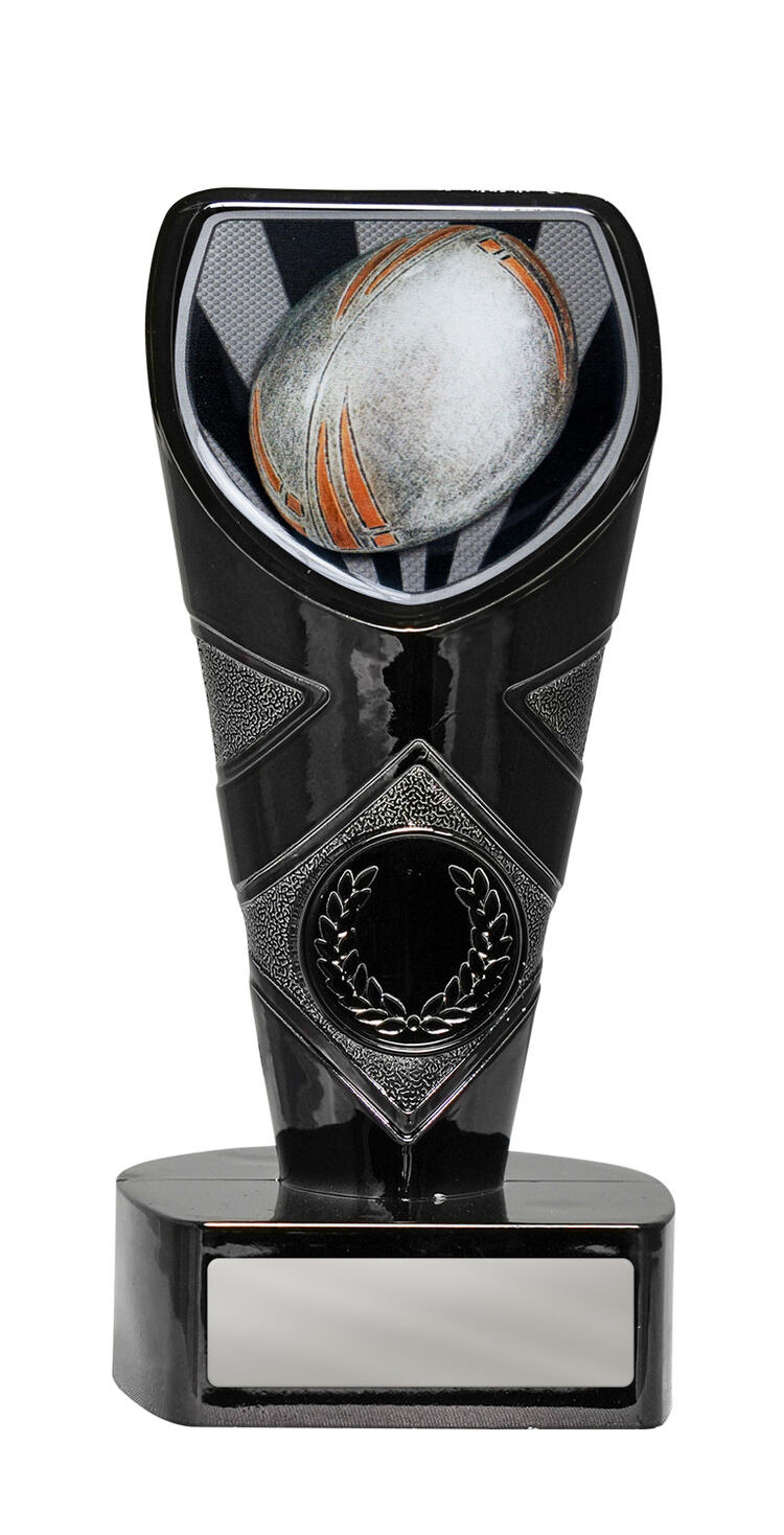 This rugby trophy features a dynamic shield shaped design, highlighted by black and silver tones for a modern finish. A detailed rugby ball motif crowns the top, while a classic laurel wreath accents the sturdy base, symbolising achievement and teamwork.