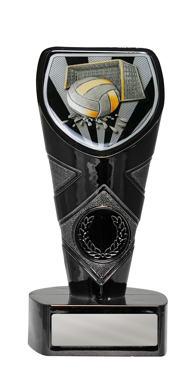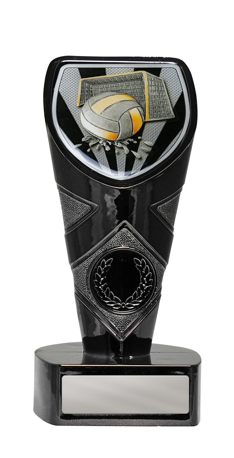 Showcasing a bold shield shaped top, this contemporary trophy features a dynamic volleyball design with a net and laurel wreath detail. The striking combination of black and silver adds visual impact. An ideal choice for recognising achievement in hockey awards and waterpolo trophies.
