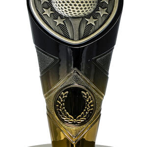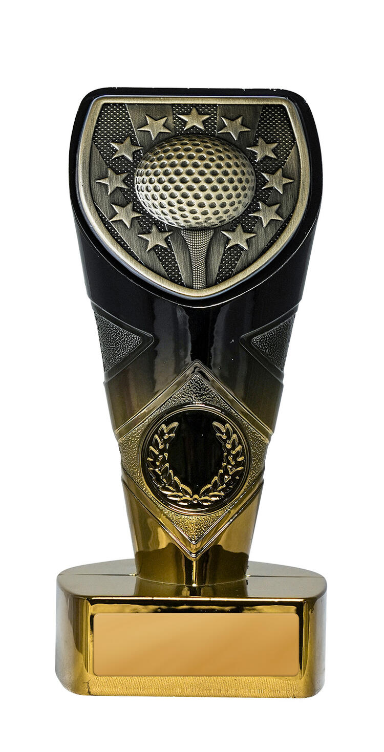 Striking and contemporary, this golf trophy combines gold, black, and bronze tones for a refined presentation. The shield shaped top frames a golf ball motif, while the laurel wreath base with a star accent adds a celebratory touch. Crafted from resin, it is ideal for recognising outstanding achievement at golf tournaments and club presentations.
