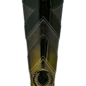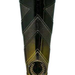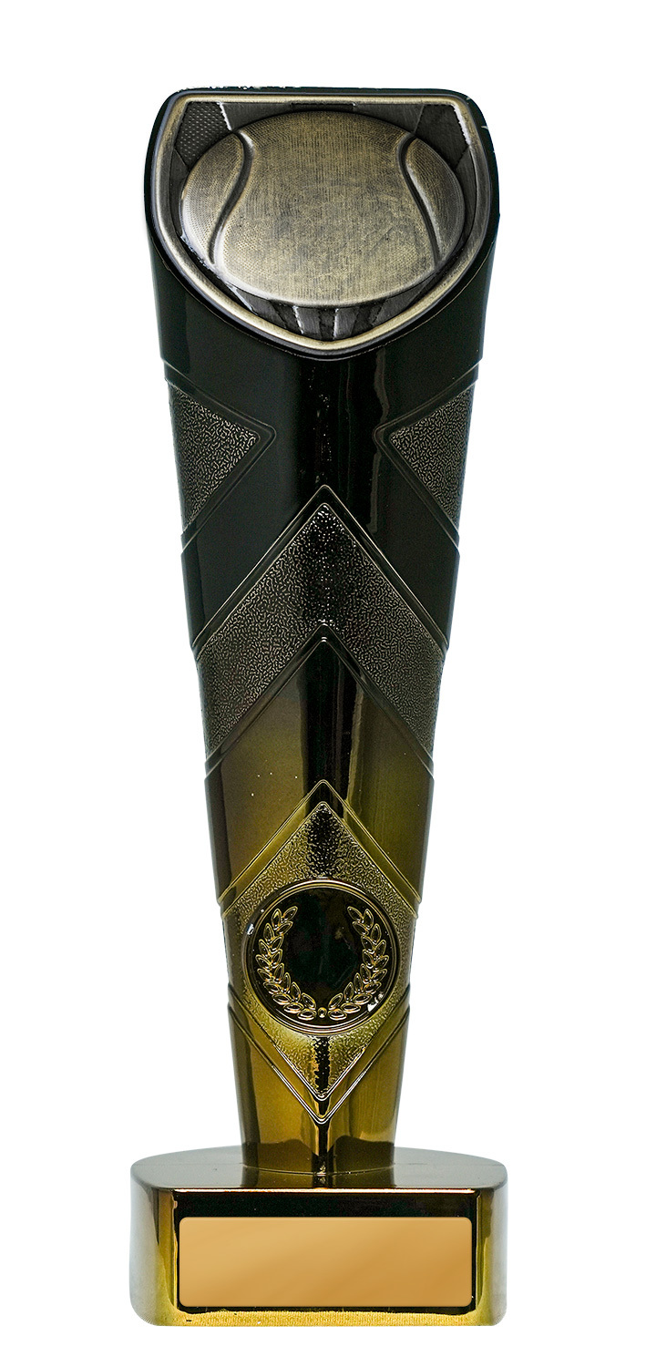 This tennis trophy features a sleek, elongated design with a rounded base, crafted from a combination of gold finished resin. A tennis ball motif crowns the award, while a laurel wreath emblem on the front symbolises sporting achievement. Its contemporary gold and black finish makes it an ideal choice for recognising excellence in tennis competitions.