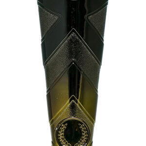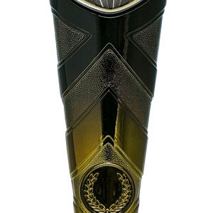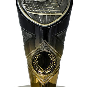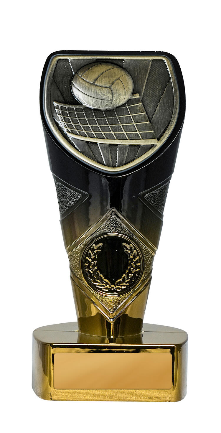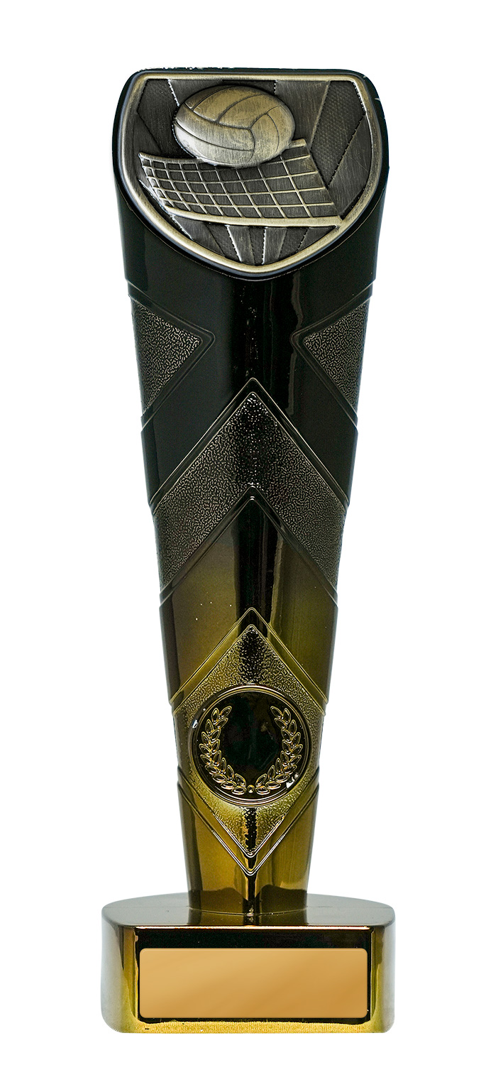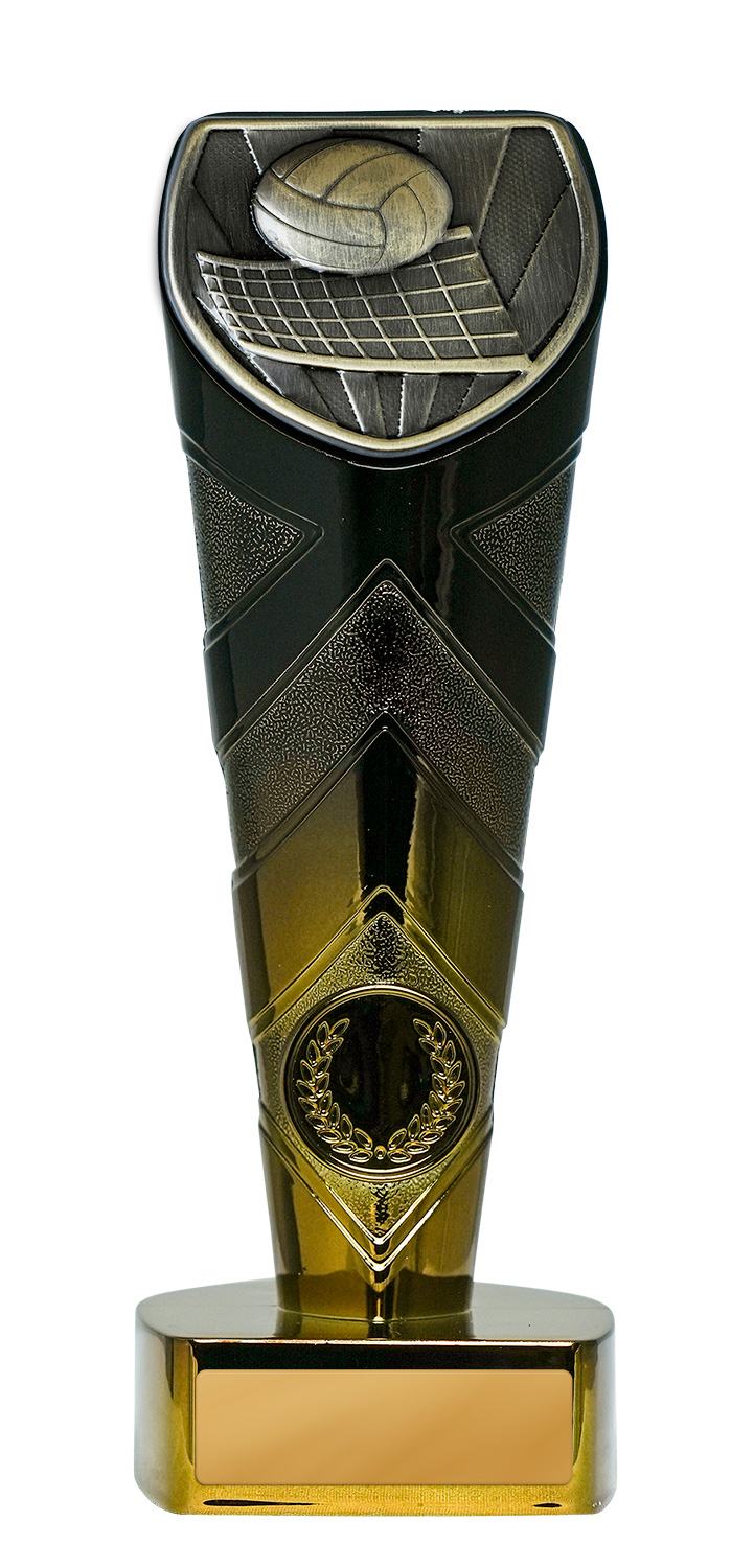 Fusing bold design with sporting spirit, this volleyball trophy features a striking blend of gold, black, and bronze. The base supports a shield like top, where a detailed volleyball and net design captures the essence of the game. Enhanced by a laurel wreath emblem, this is a distinguished choice among volleyball trophies for crowning champions with confidence and style.