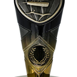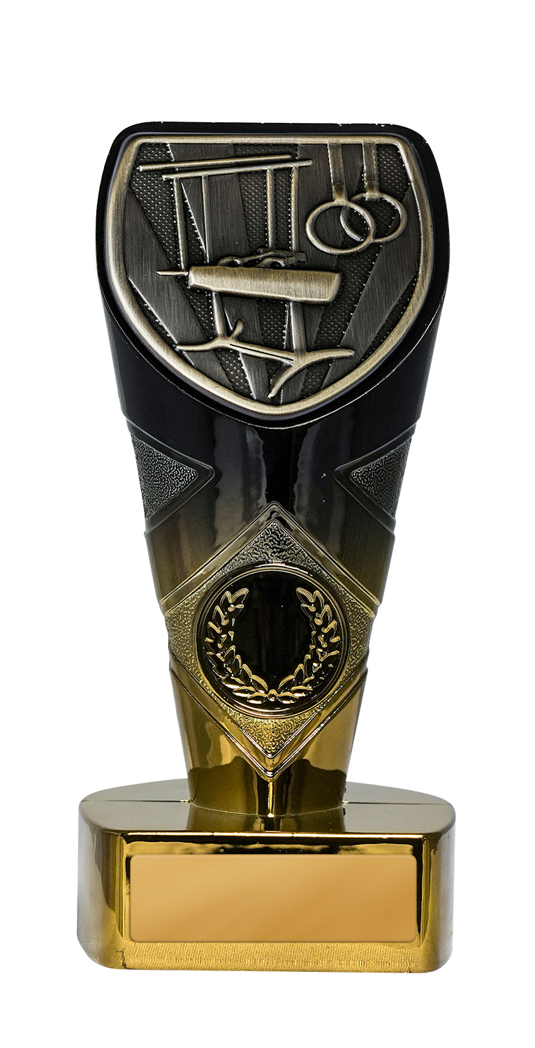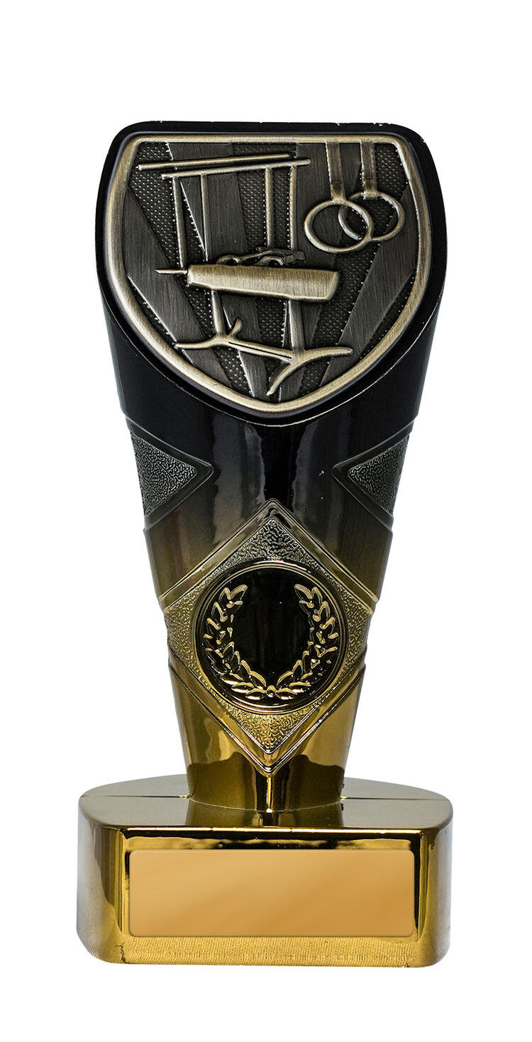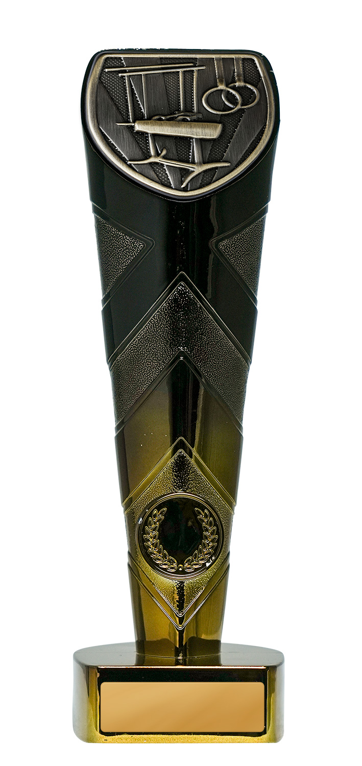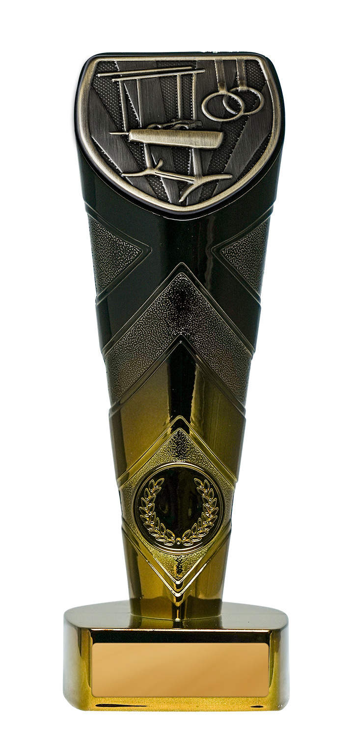 This sports award trophy stands out with its elegant gold and black finish and contemporary design, making it an excellent choice among gymnastics trophies. Crafted from resin, it features a broad base and a tapered top adorned with detailed symbols of rings, parallel bars, and a pommel horse. A customisable engraving plate with easy to read black text completes this professional and memorable recognition piece.