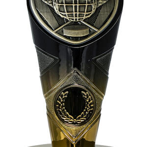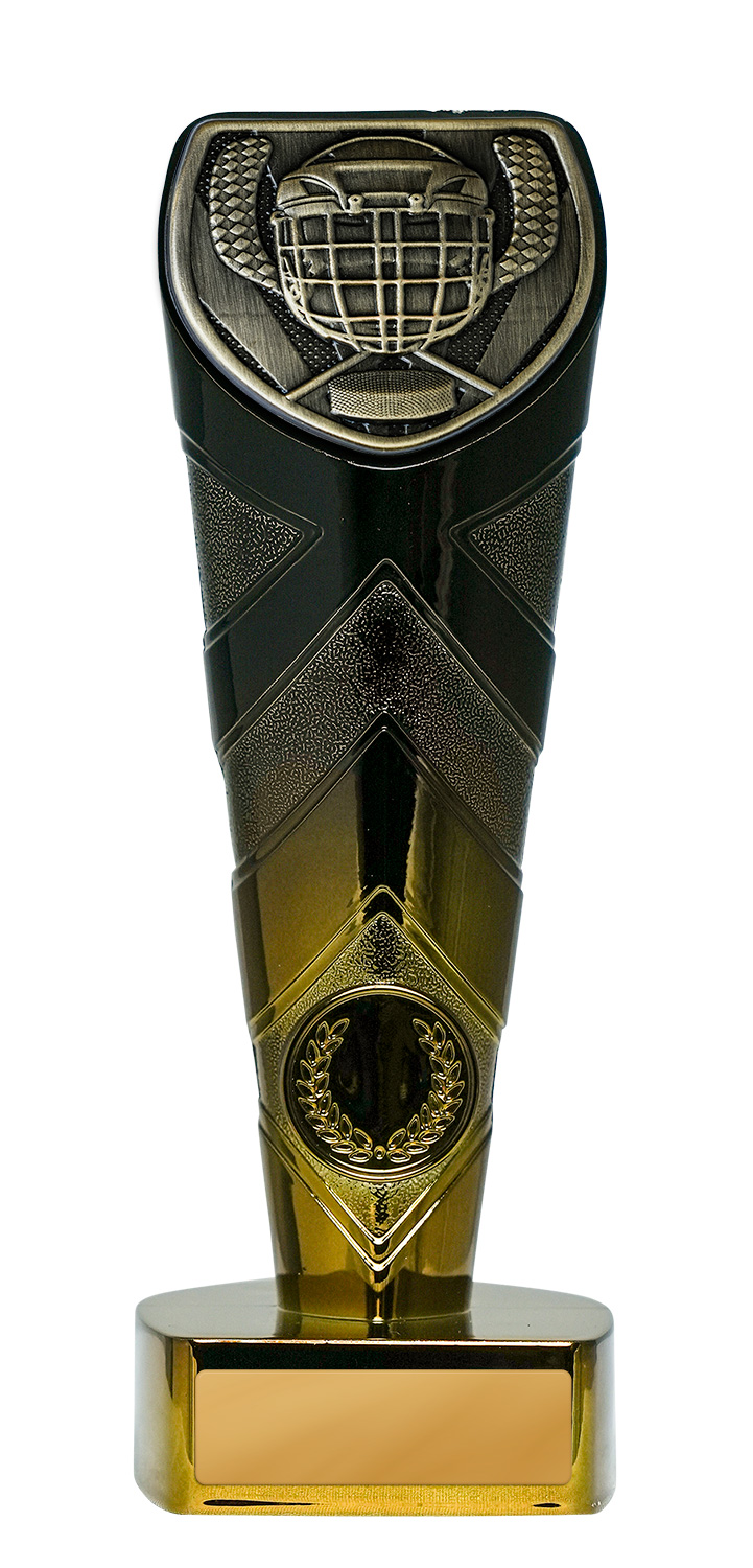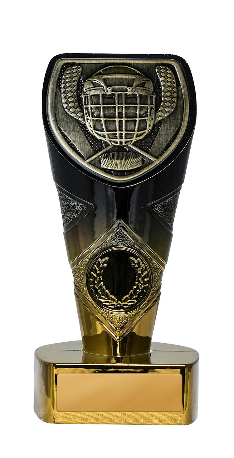 This contemporary trophy is designed for ice hockey awards and features a striking fusion of gold and black finishes. The resin construction ensures a durable yet elegant presence, highlighted by a shield shaped top with a detailed hockey helmet and crossed sticks. A laurel wreath motif on the lower section adds a timeless sense of achievement, making it a memorable choice for recognising sporting excellence.