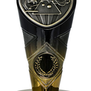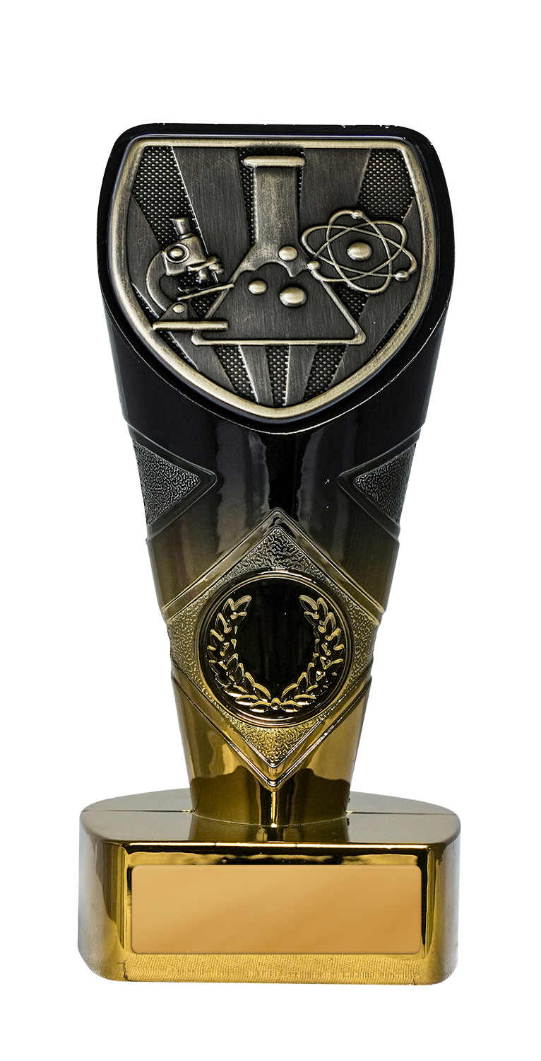 This science themed award features a shield shaped design in gold, black, and bronze, highlighted by detailed symbols of a microscope, atom, and flask. Crafted from resin, it offers a polished and durable finish, suitable for recognising excellence in academic and scientific pursuits. An excellent choice for science awards and education trophies, it delivers a meaningful tribute to achievement.