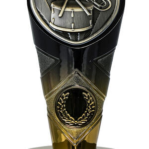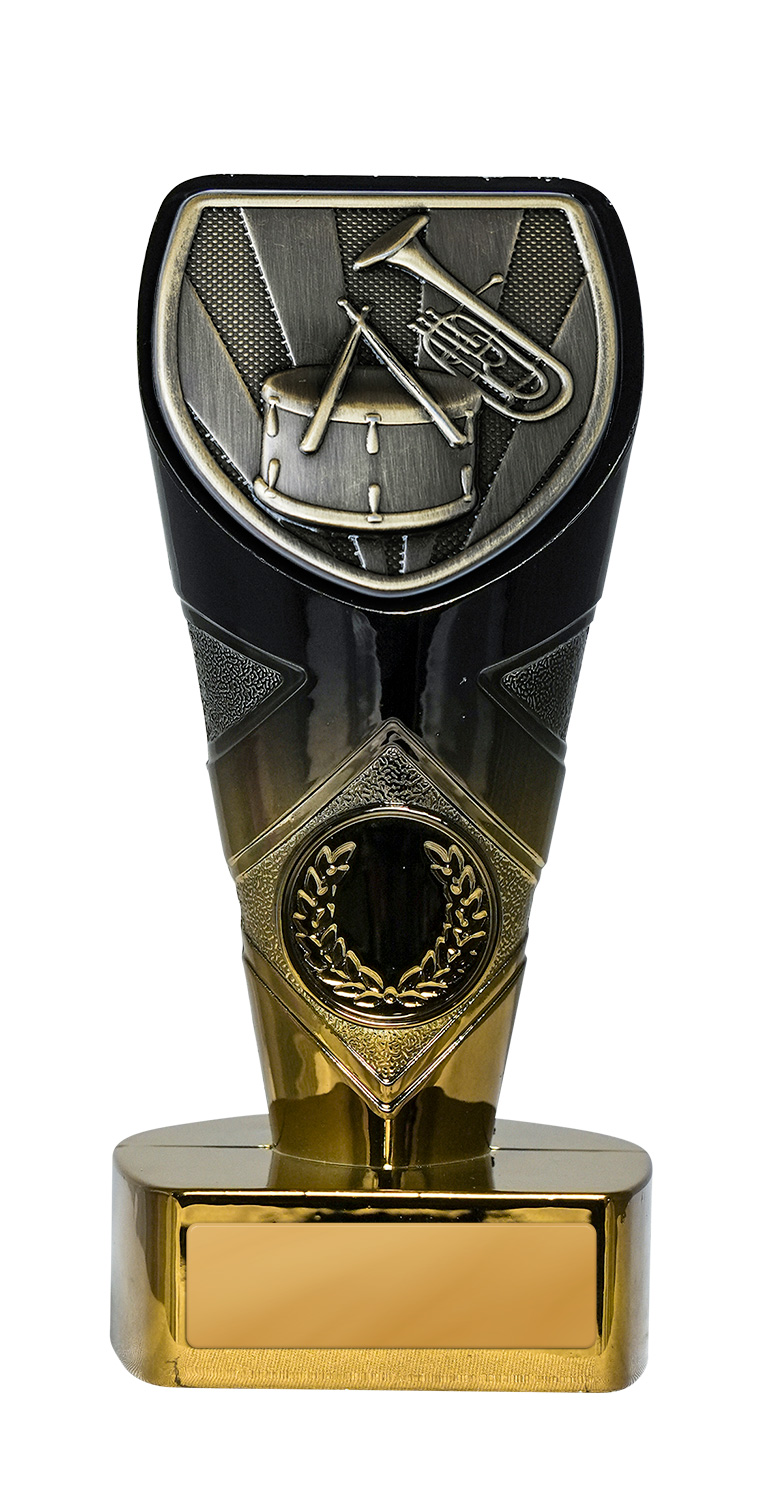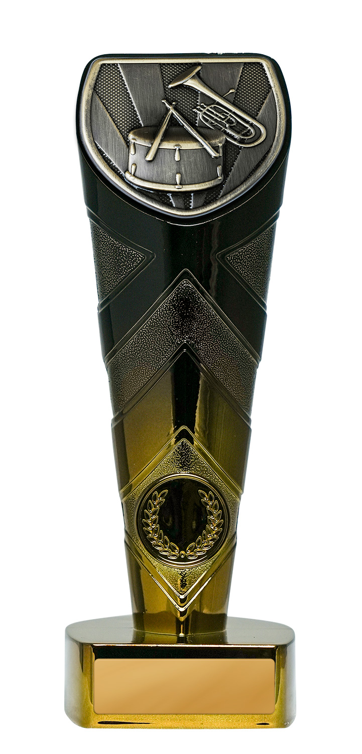 This music award presents a striking combination of gold, black, and silver tones, highlighted by a tapered design and a broad, stable base. A detailed drum and trumpet crown the top, while the laurel wreath on the base underscores achievement in music. Crafted from resin, this musical trophy is ideal for recognising standout performances and dedication.