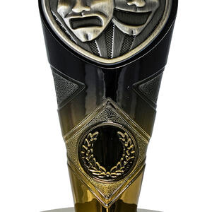 Striking in gold, black, and silver, this shield shaped trophy showcases comedy and tragedy masks to honour theatrical excellence. It is designed for drama trophies presentations in schools, clubs, or community performances. Gold accents and a dark, sturdy base add sophistication, while personalisation options ensure a memorable recognition experience.