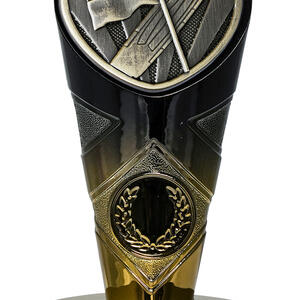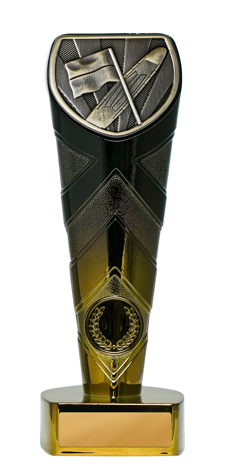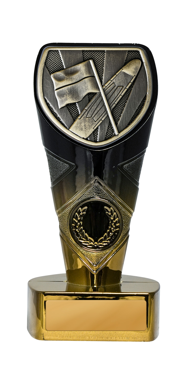 Celebrate achievement with this striking surf life saving trophy, crafted from resin in a refined gold and black finish. The design features a detailed shield emblem with crossed flags, set atop a base adorned with a laurel wreath. This award offers a memorable and professional way to honour outstanding performance.