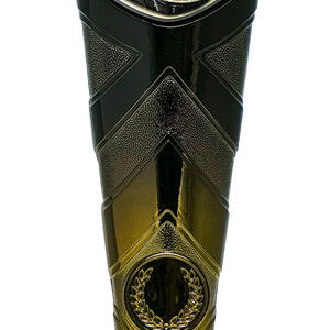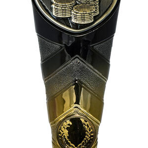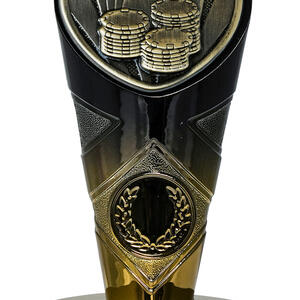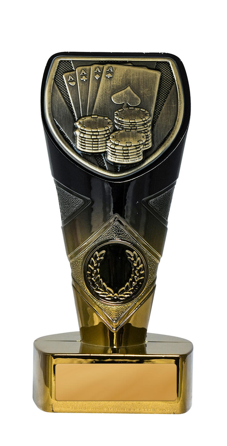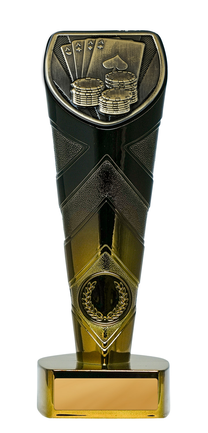 This poker trophy delivers a bold statement with its gold and black finish, shield shaped top, and distinctive card game motifs. Detailed playing cards, poker chips, and a spade symbol highlight its purpose, while a laurel wreath accent on the lower portion celebrates achievement.