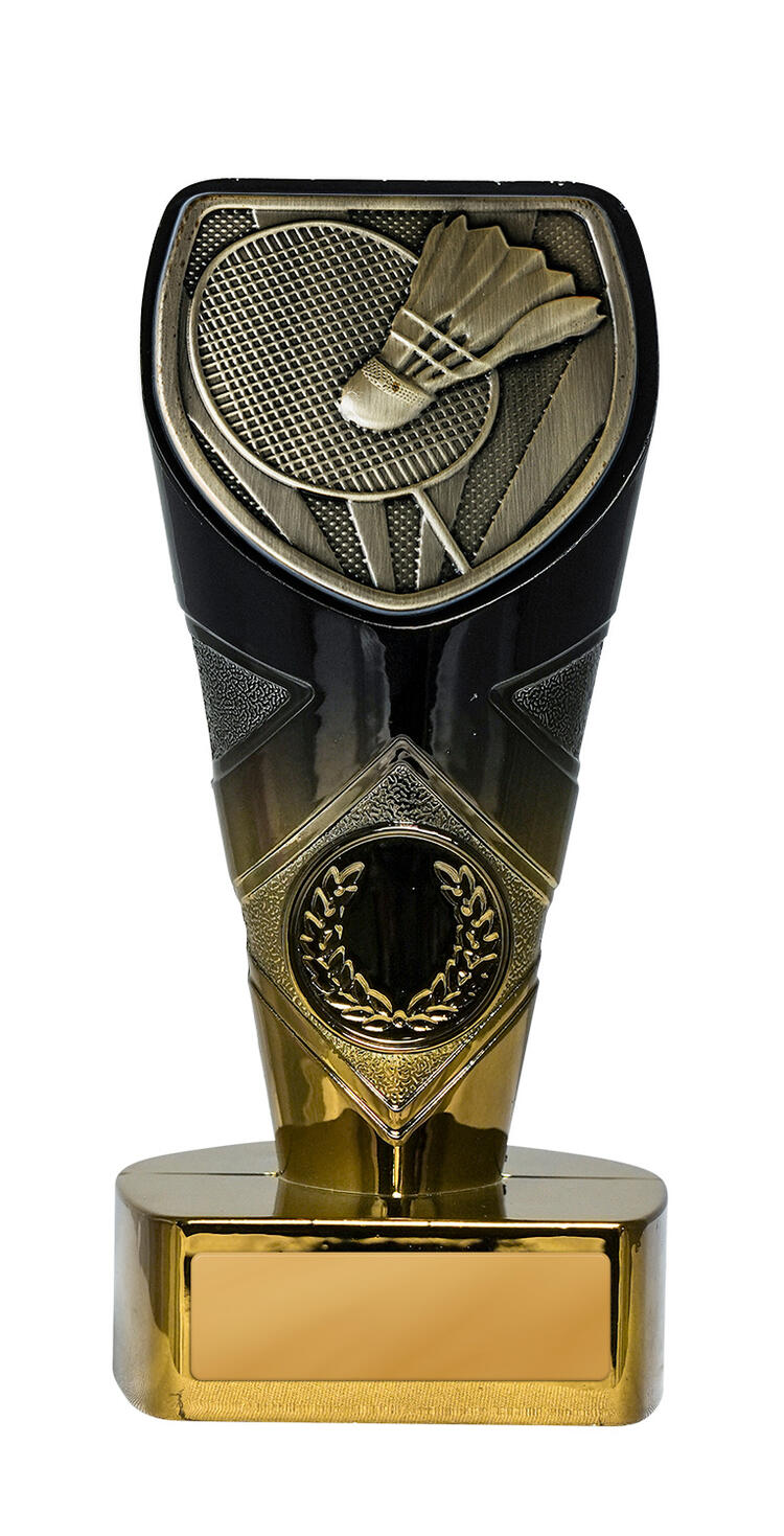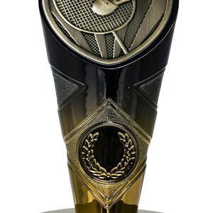 This badminton trophy features a striking gold and black Fusion Cobra design, highlighted by a dynamic badminton racket and shuttlecock at the top. Its trophy like shape, with a wide top and narrow base, is crafted from resin, providing a reliable and elegant finish. The laurel wreath emblem at the base adds a touch of prestige, making it a memorable choice for recognising standout performance in badminton.