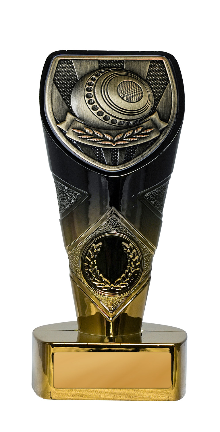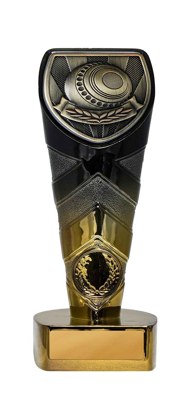 This elegant lawn bowls trophy is crafted with a striking gold and black finish, showcasing a sturdy resin construction for lasting quality. Its wide top and narrow base create a classic silhouette, while the detailed lawn bowl motif and laurel wreath accentuate its celebratory purpose. Designed for lawn bowls competitions, this award provides a memorable symbol of sporting achievement.