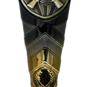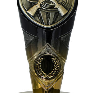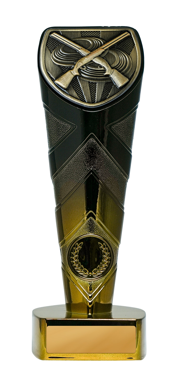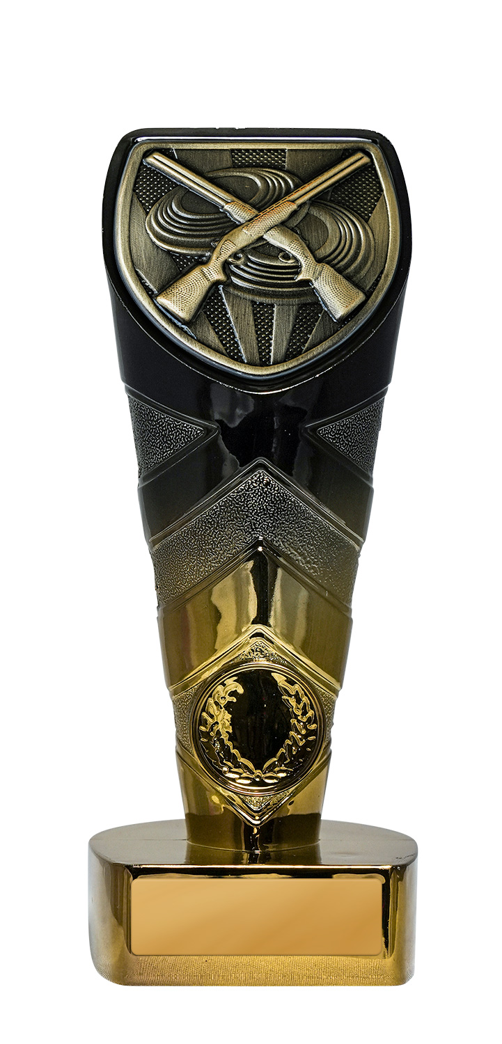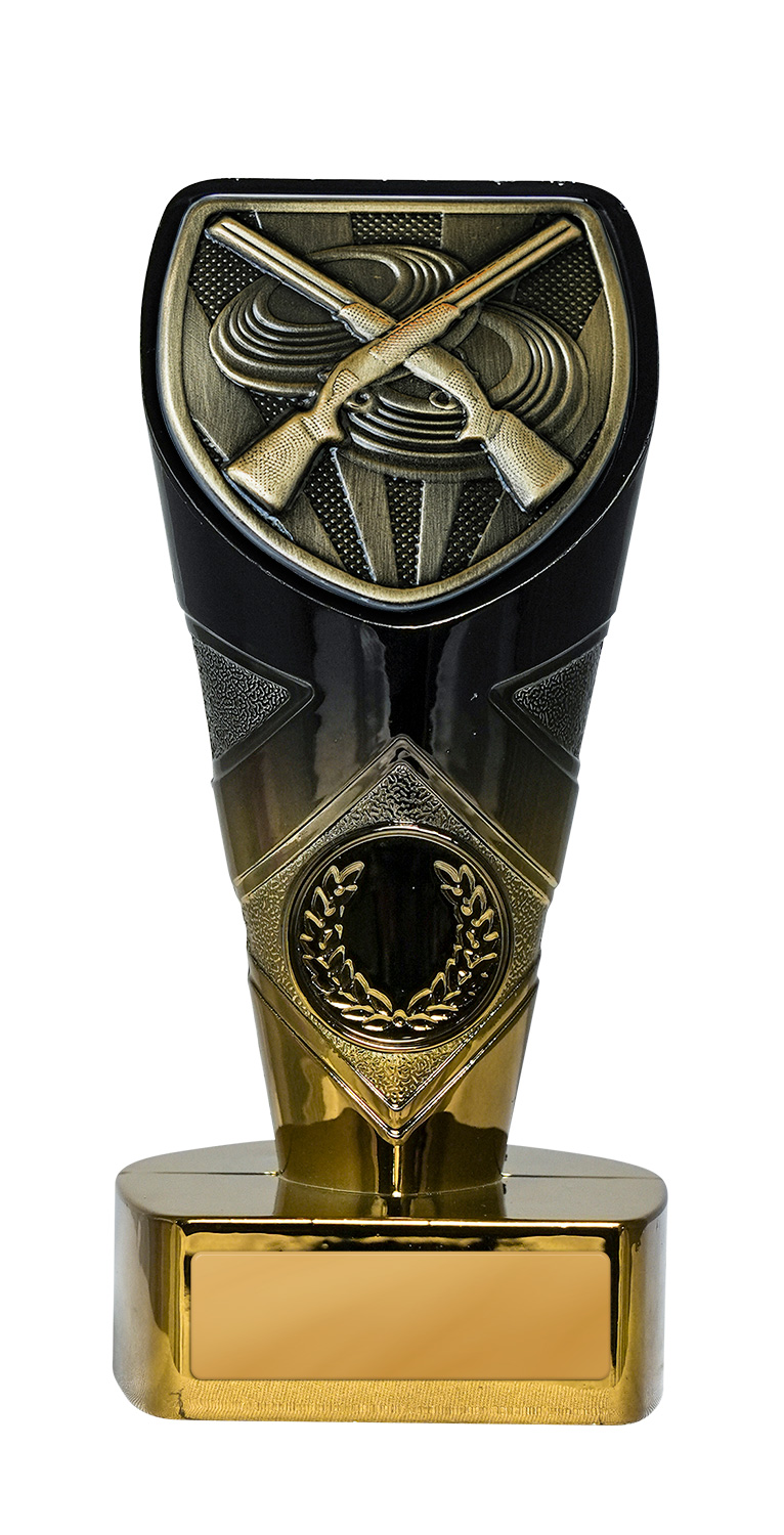 This sports award trophy brings together precision and prestige, crafted for excellence in shooting competitions. The trophy features crossed rifles and a laurel wreath, set against a shield shaped top in a sophisticated gold, black, and bronze finish. Designed for shooting trophies presentations, it offers a memorable and elegant symbol of achievement for clubs and associations.