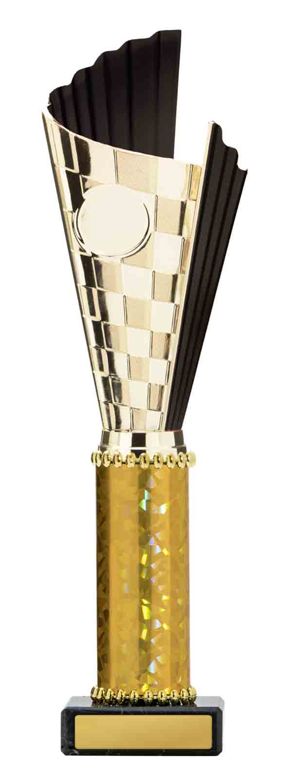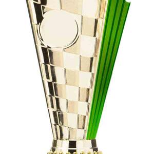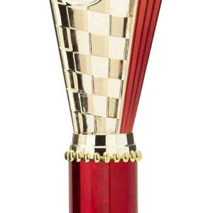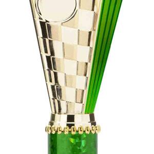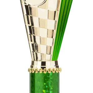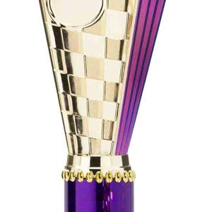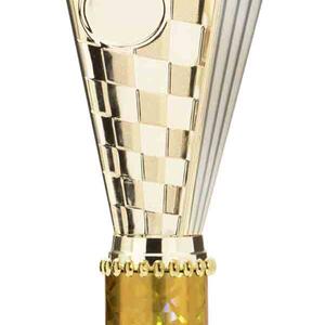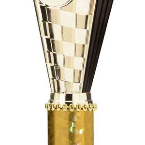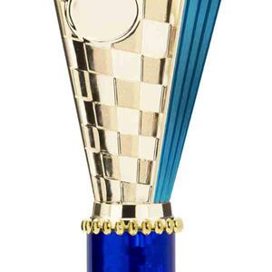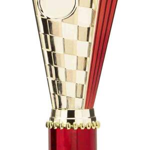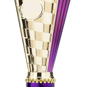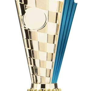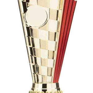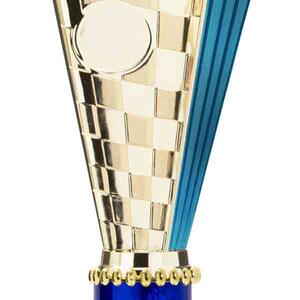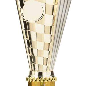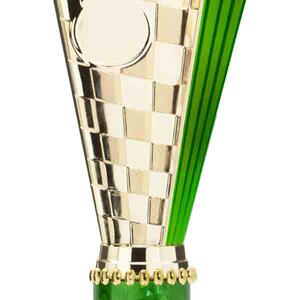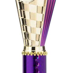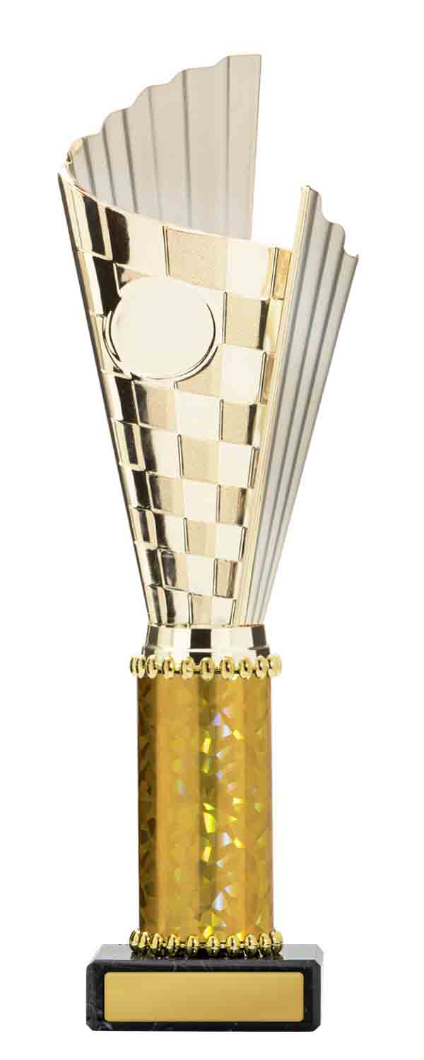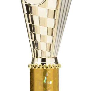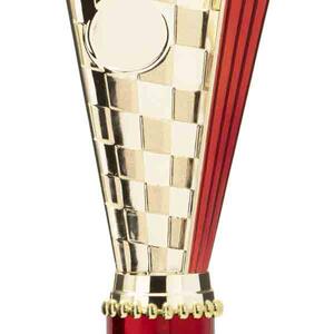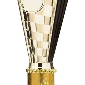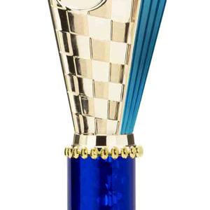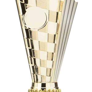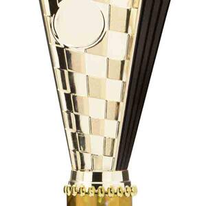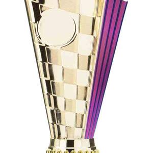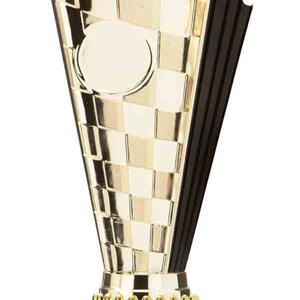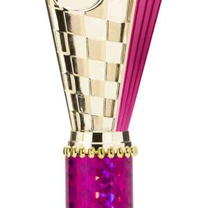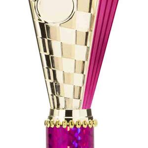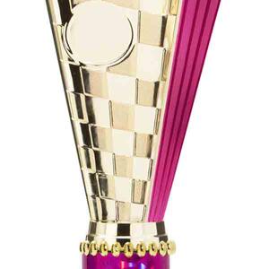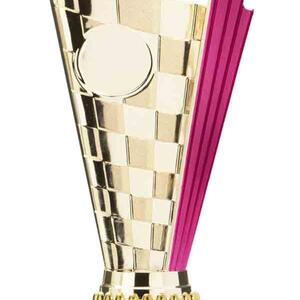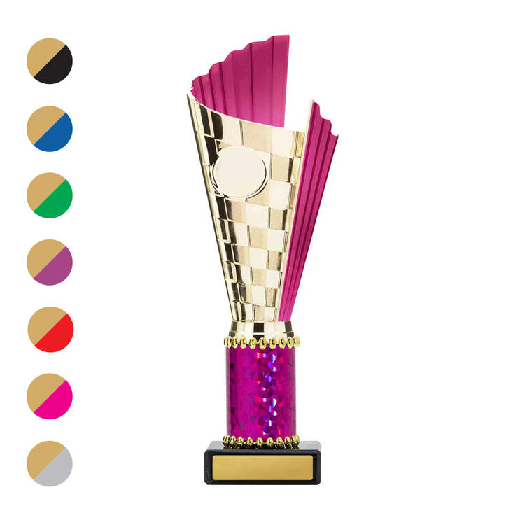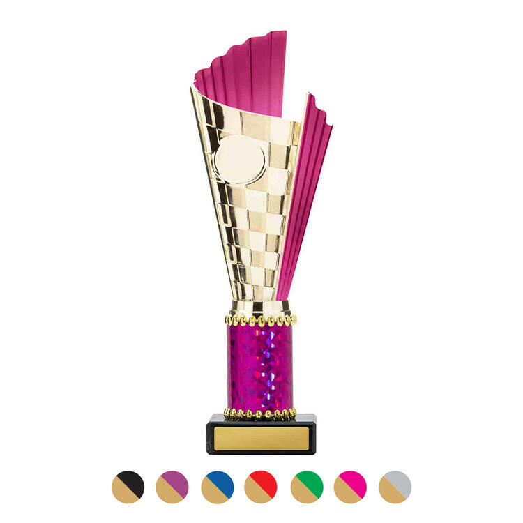 This sports trophy cup stands out with its elegant flared top, base, and dynamic checkered pattern, making it an ideal winner cup trophy for a variety of sporting events. Crafted from plastic, it is available in bold colour combinations including gold with pink, black, red, blue, silver, purple, and green. A 25mm centre allows for customisation, ensuring every award is both professional and memorable.