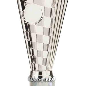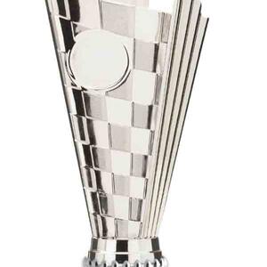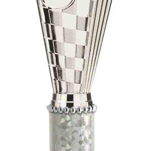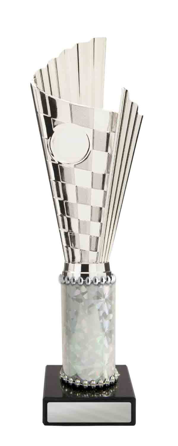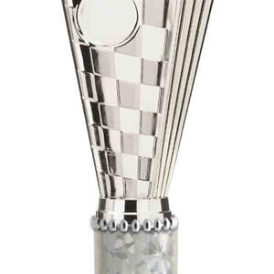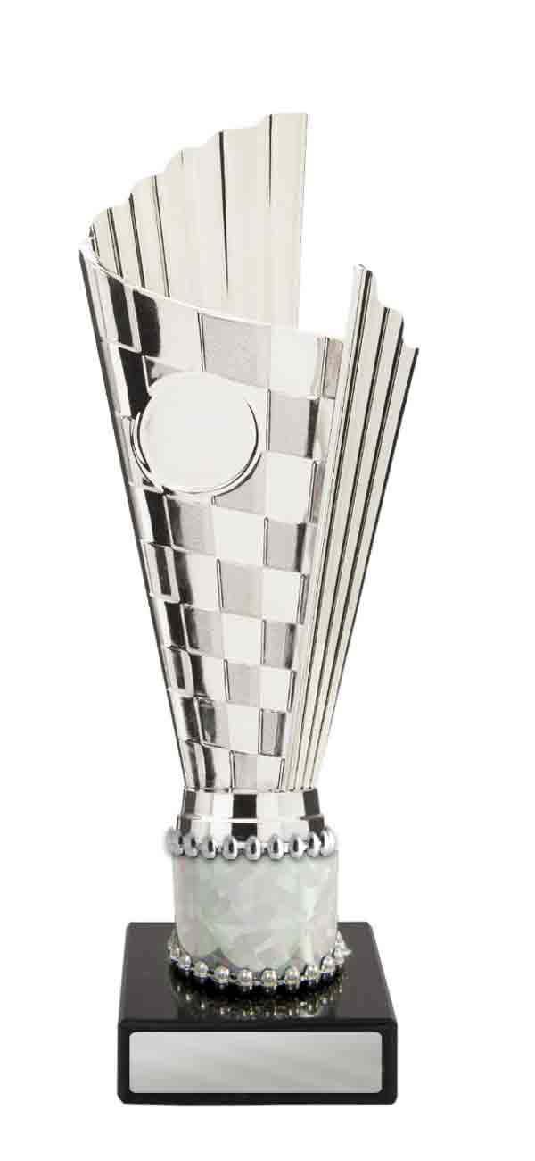 Showcasing a distinctive flared design, this silver trophy cup combines a striking fan like top with accents and a black checkered pattern for standout appeal. Crafted plastic with a black base and is finished with an elegant engraving plate for personalised recognition. Ideal for a broad range of trophy cup awards.