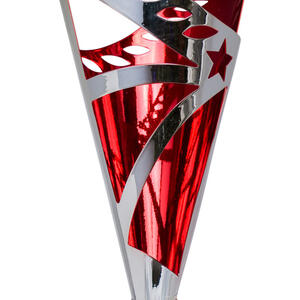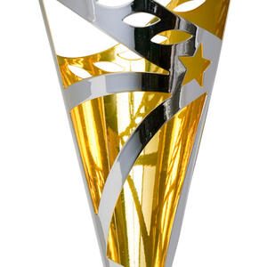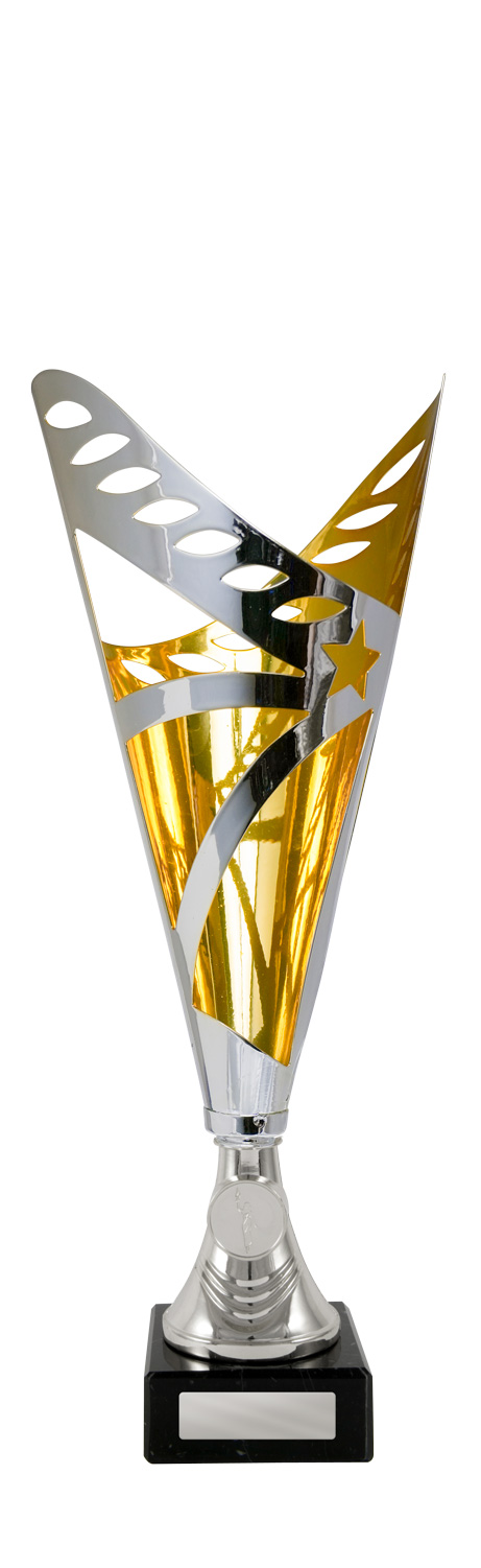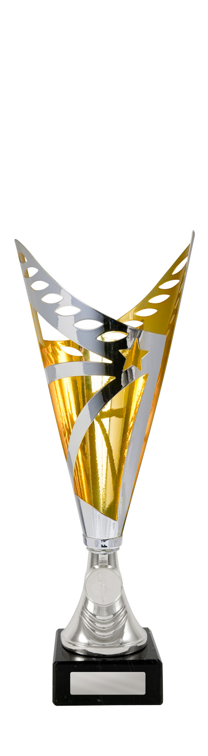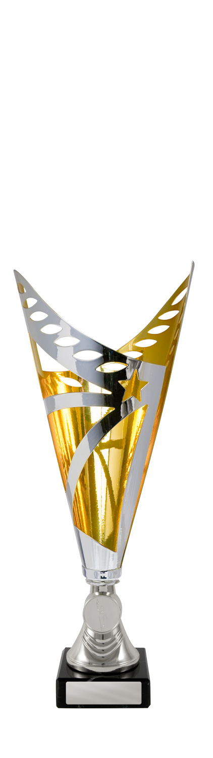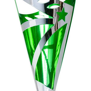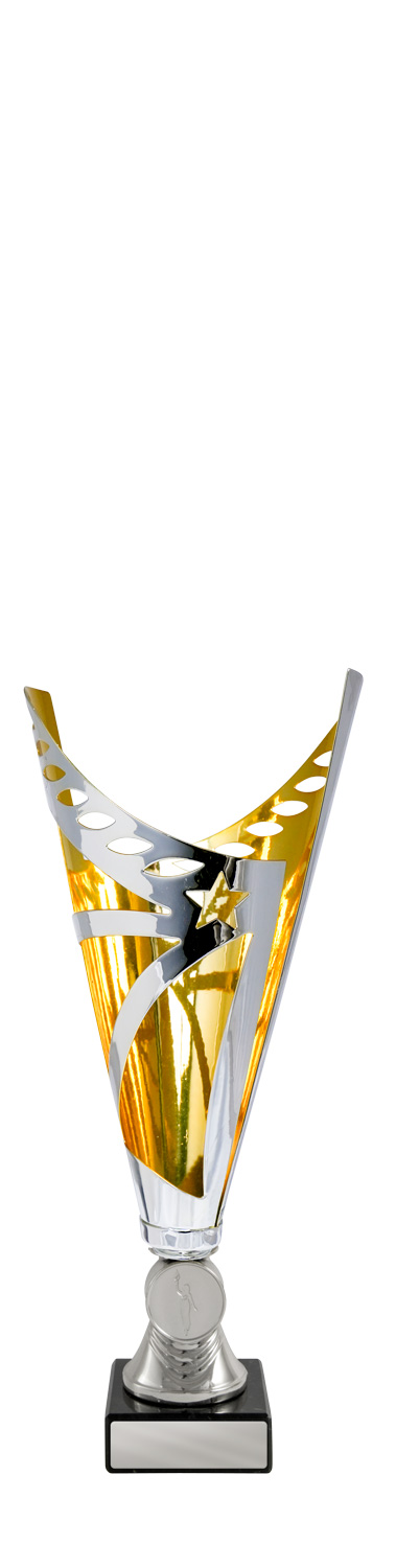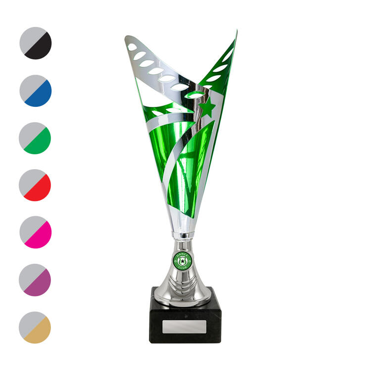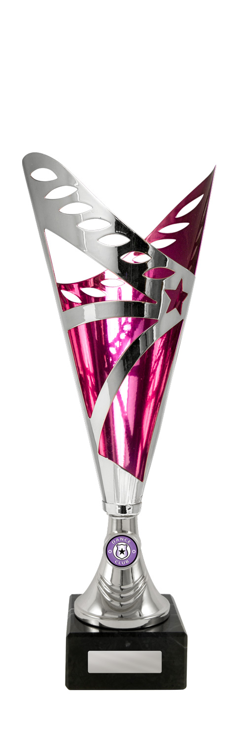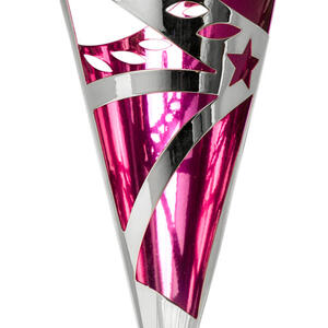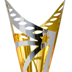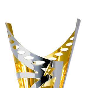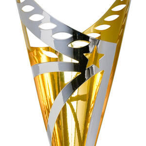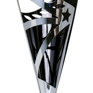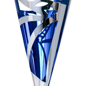 Designed for dance awards, this contemporary trophy cup presents a dynamic conical silhouette with decorative cutouts and prominent star motifs. The metallic upper section, available in vibrant blue, green, gold, and pink, is paired with a black base for a refined finish. Offering personalisation, it is an ideal choice for recognising dance achievement in a memorable and professional way.