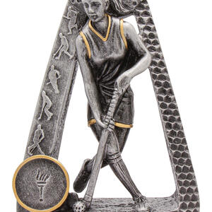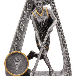 Celebrate achievement with this striking hockey trophy, crafted in silver and gold tones for a refined, memorable presentation. The triangular frame highlights a detailed field hockey player figure in action, accompanied by a torch emblem and a realistic hockey ball. Durable resin construction makes it a professional choice for recognising excellence in field hockey.