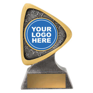 Stylish and contemporary, this silver and gold resin trophy features a triangular design filled with star accents. The round centre area is perfect for your custom logo or a standard sport insert.
