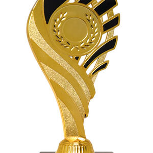 Celebrate achievement with this elegant dance cup, crafted with a contemporary abstract design and layered curves. Featuring a gold laurel wreath centre framed by dynamic star accents, this trophy cup is mounted on a black marble base for a professional finish. It is ideal for recognising excellence across competitions and events.