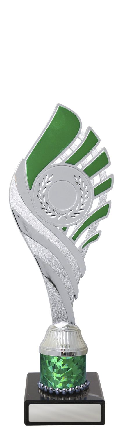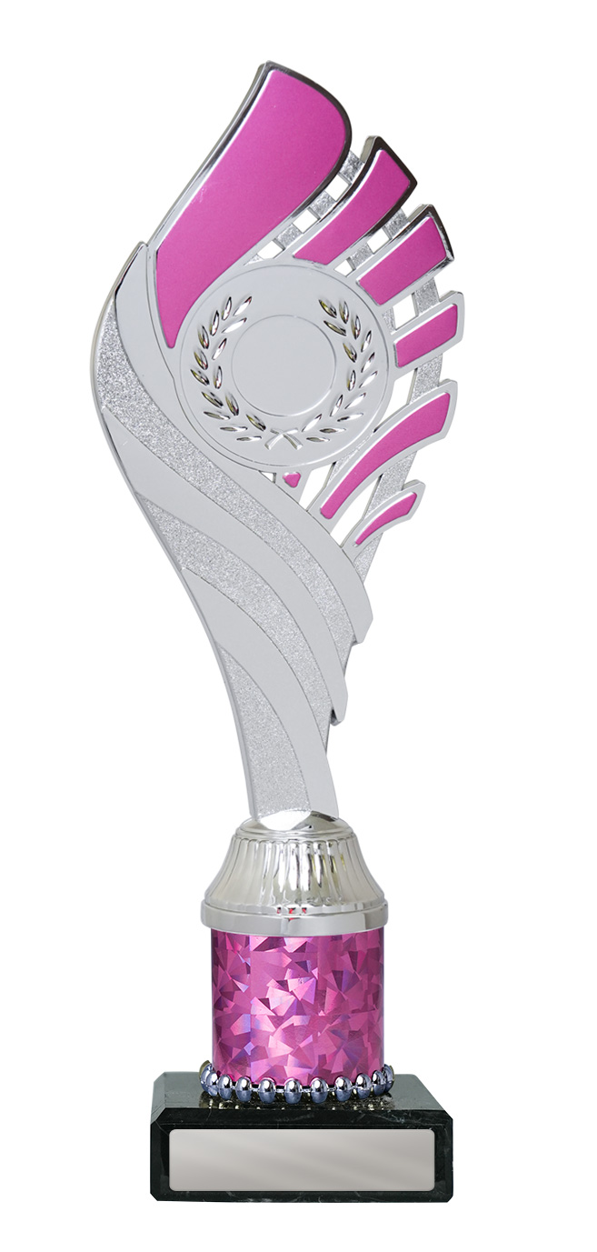 Striking and contemporary, these dance cups feature a distinctive, curved fan like silhouette, beautifully complemented by a decorative base. The collection is available in a rich selection of colours, including purple, black, red, pink, green, silver, gold, and blue. Crafted from durable plastic and metal, these trophy cups provide a professional and elegant solution for a wide range of celebratory occasions.