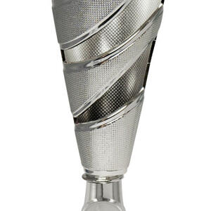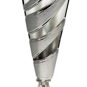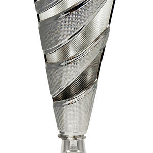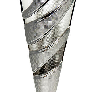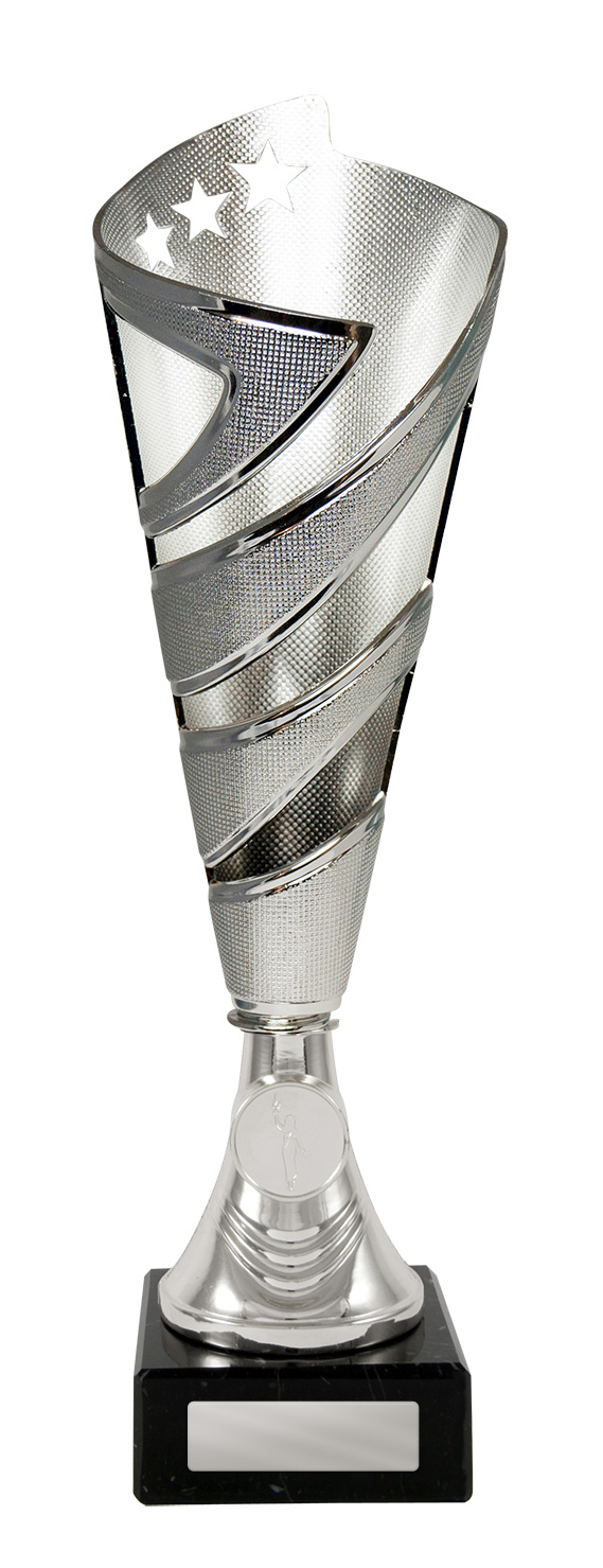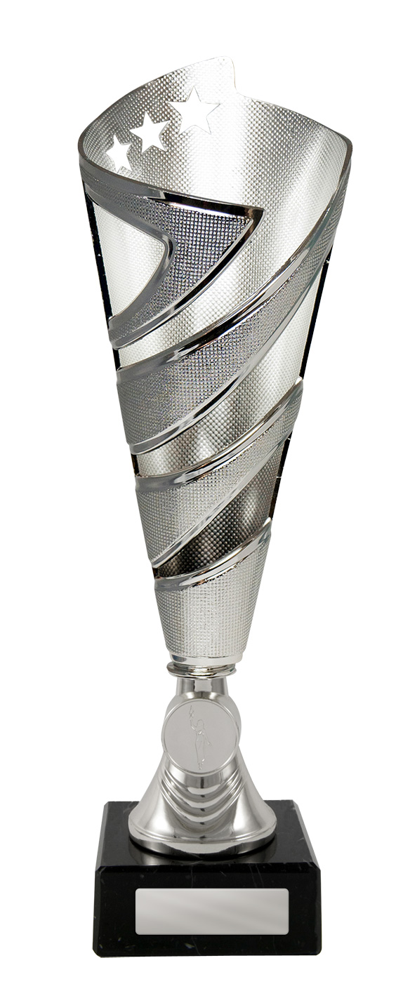 A striking blend of style and sophistication, this dance cup trophy is crafted in silver toned metal and features a contemporary conical shape with a dynamic spiral design. Star cutouts and a refined textured finish add depth and distinction, while the sturdy black marble base anchors the award. Ideal for recognising achievement across a range of events, these trophy cups provide an elegant space for personalised details, making every accolade memorable and unique.