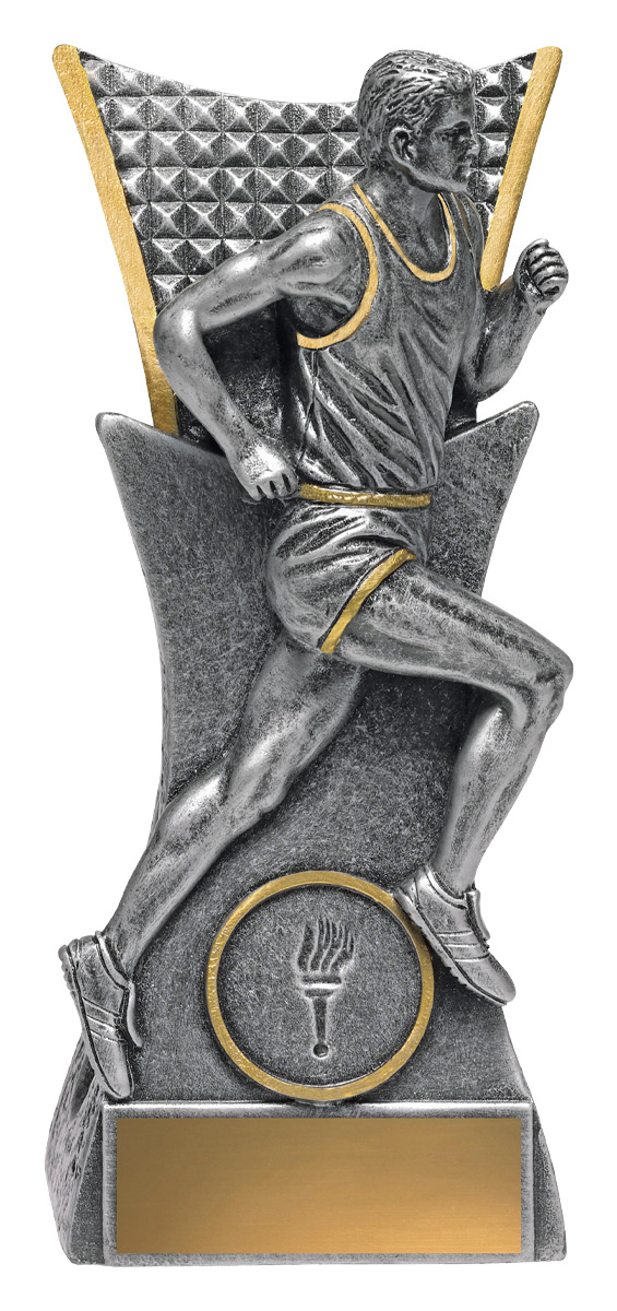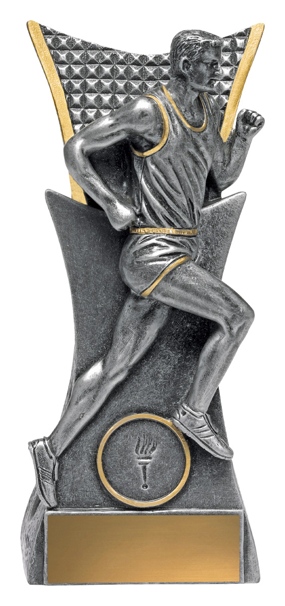This athletics trophy features a striking male runner figure captured in mid stride, embodying athleticism and progress. Crafted in gleaming silver and gold with a refined metallic finish, it includes a torch emblem that signifies achievement in running and athletics. The elegant base completes this durable and distinguished recognition piece.