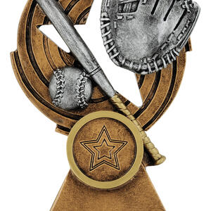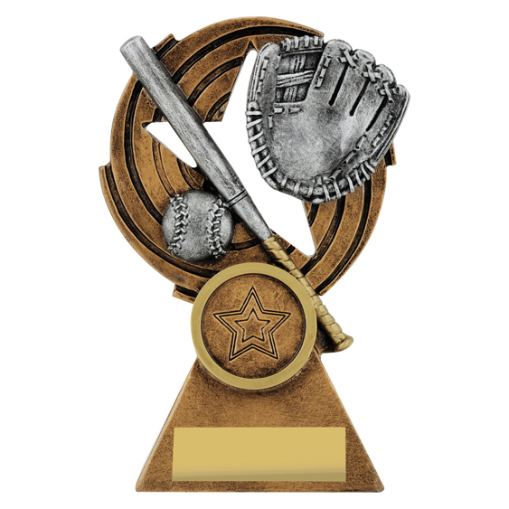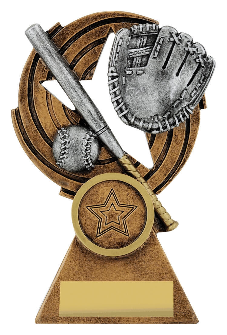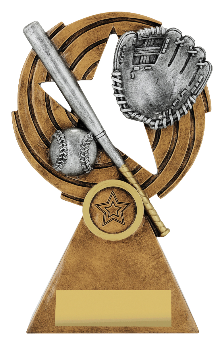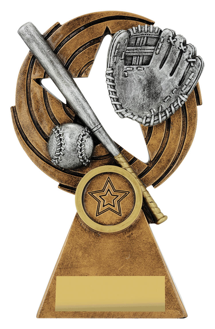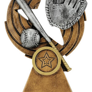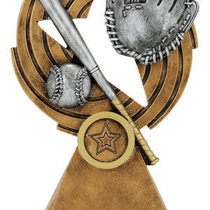 Crafted in gold and silver, this baseball trophy features a distinctive circular design set on a triangular base. The detailed bat, glove, and ball motif captures the essence of the sport, making it an ideal choice for recognising outstanding performance. Durable resin construction ensures lasting quality for any baseball celebration.