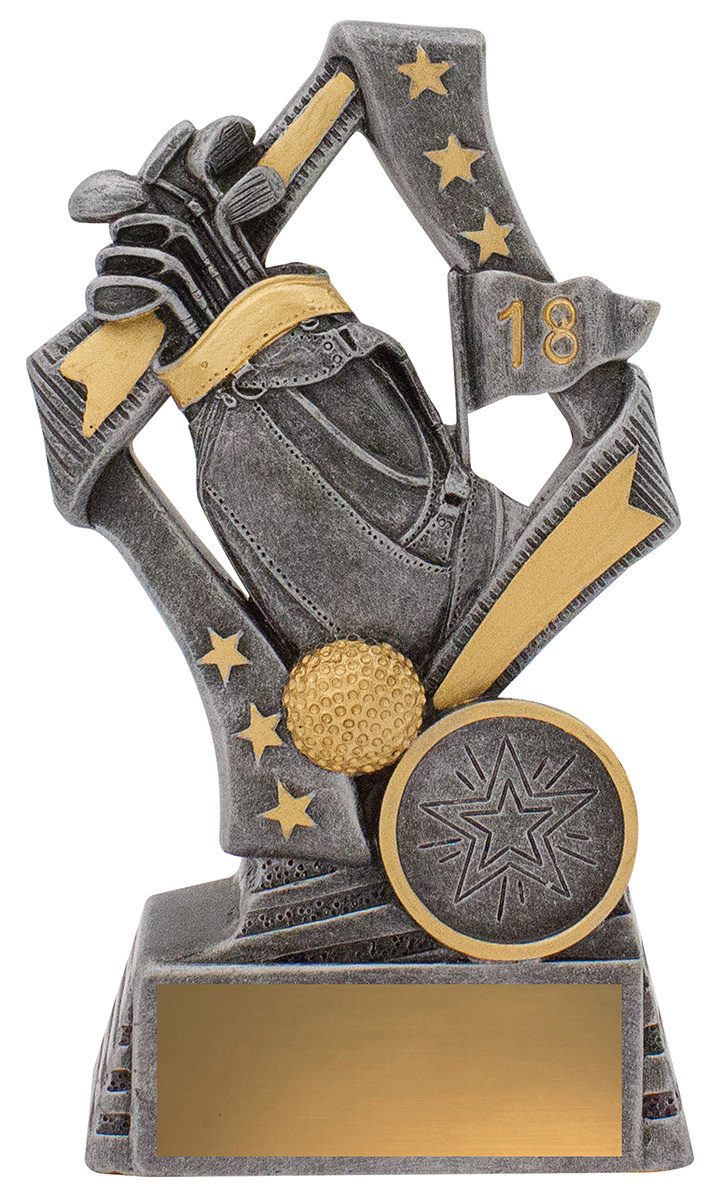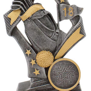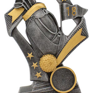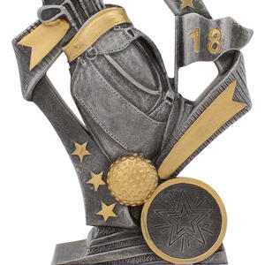 This resin golf trophy brings the spirit of the course to your recognition event, featuring a detailed golf bag, clubs, and ball highlighted in silver and gold. The star motif and number 18 capture the achievement associated with a full round. Crafted for durability and elegant display, it is ideal for celebrating exceptional performance on the greens.