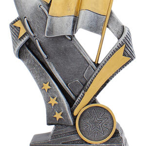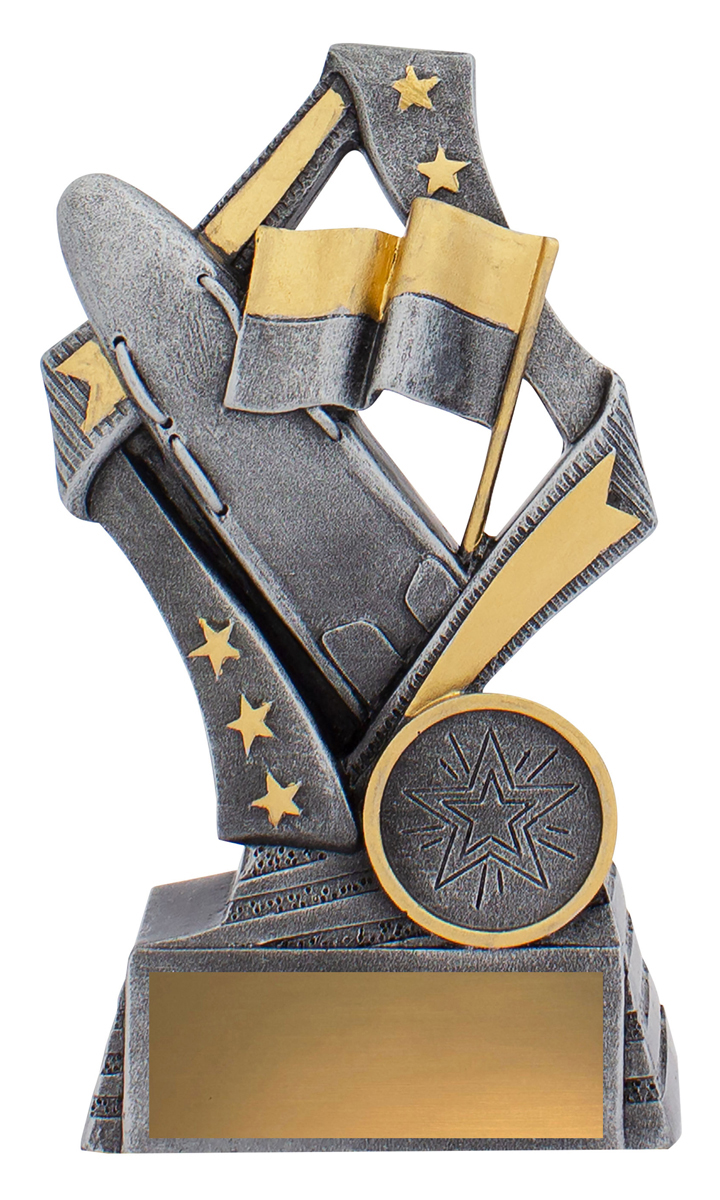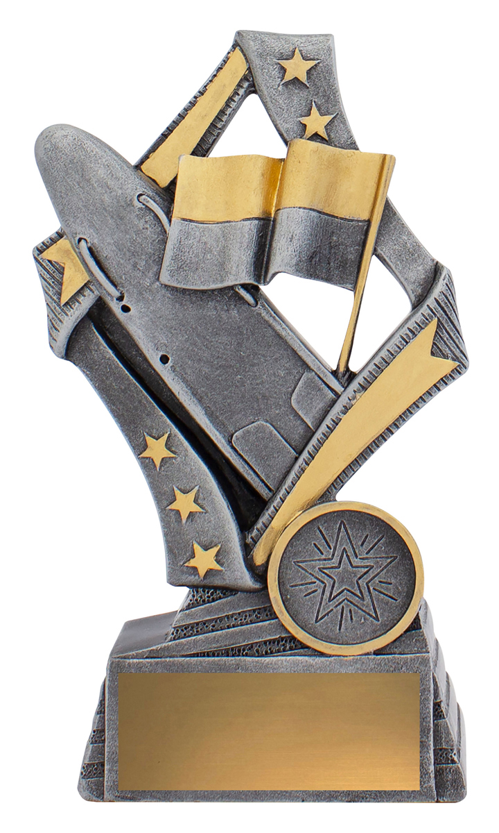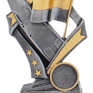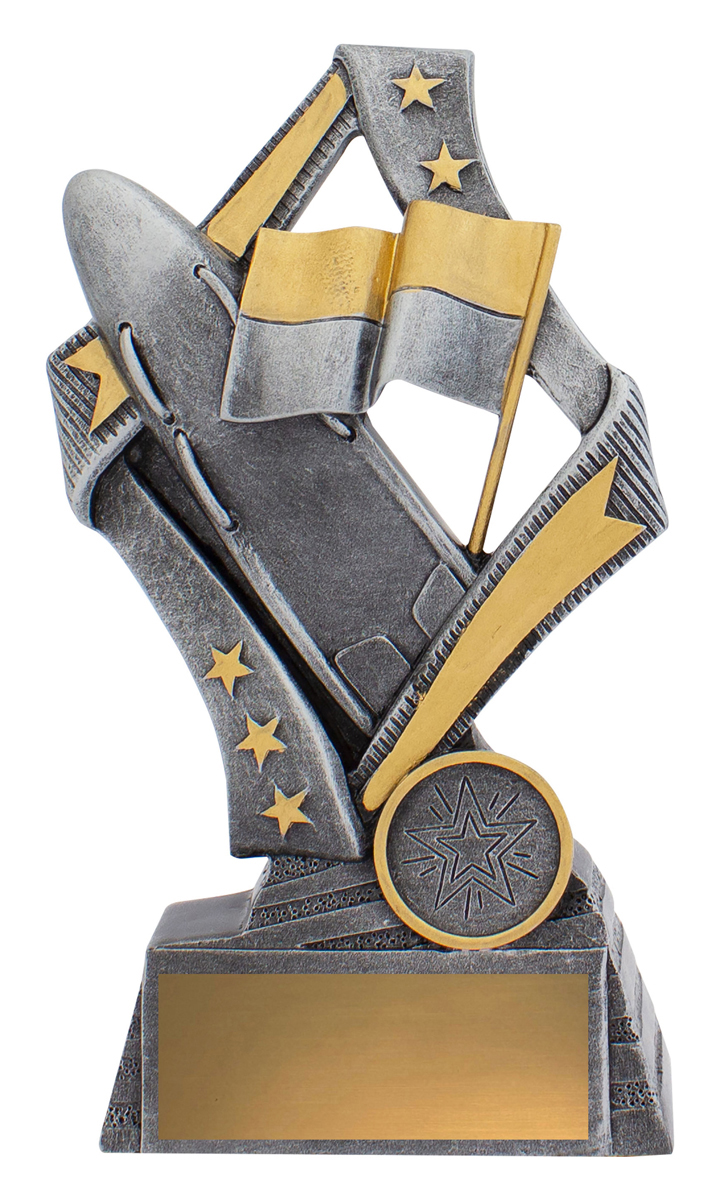 Crafted for distinction, this surf lifesaving trophies design captures the spirit of achievement with a striking combination of silver and gold tones. The trophy features a detailed plane soaring above stars and a flag motif, all set on a sturdy base. Its elegant metallic finish and celebratory symbols make it ideal for honouring aviation or lifesaving accomplishments.