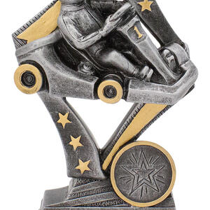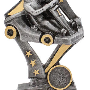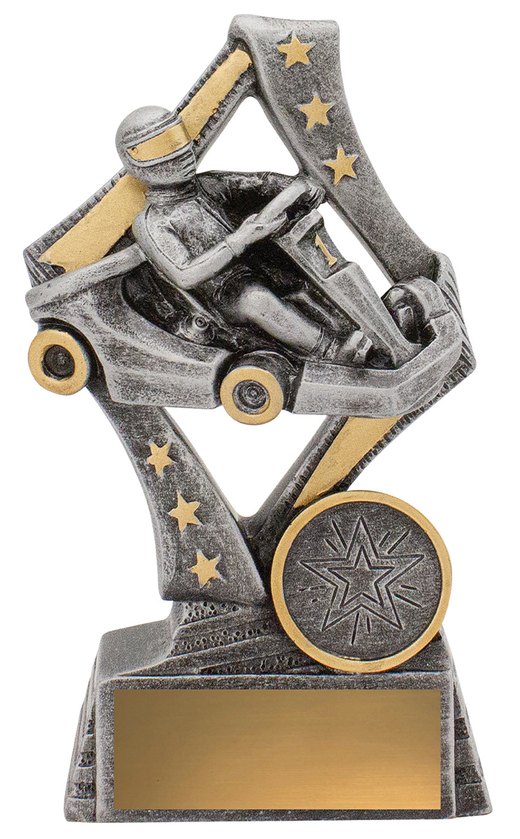 Celebrate motorsport achievement with this go kart trophy, crafted in striking silver and gold tones. Featuring a go kart racer in motion, complemented by star detailing and a sleek metallic finish, this award brings energy and sophistication to any racing event, making it a lasting symbol of accomplishment on the track.