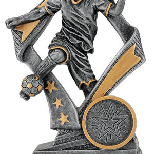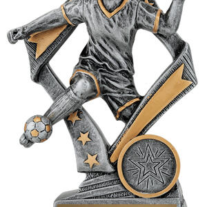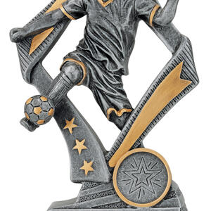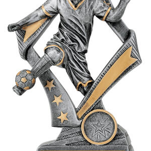 Celebrate achievement with this striking football league trophy, crafted in durable resin with an expressive silver and gold finish. The dynamic design captures a football player in motion, set against stars and a football motif, symbolising dedication and skill.