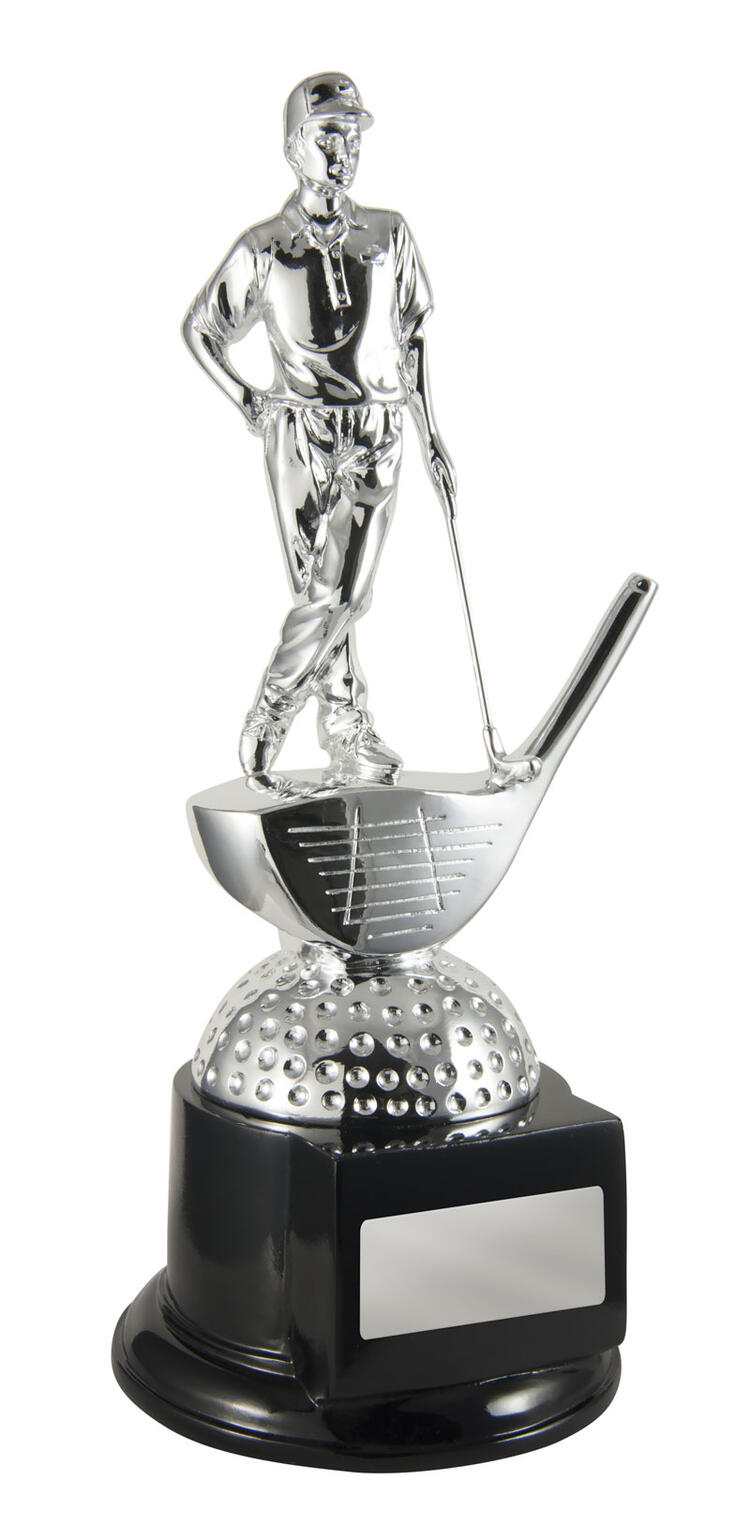Showcasing a poised golfer atop a golf ball and club motif, this trophy blends antique silver tones with a refined black base. Crafted for distinction, it offers a lasting tribute to achievement in golf tournaments. With its elegant form and dedicated plates for ongoing recognition, this piece stands as a trusted choice in golf trophies.