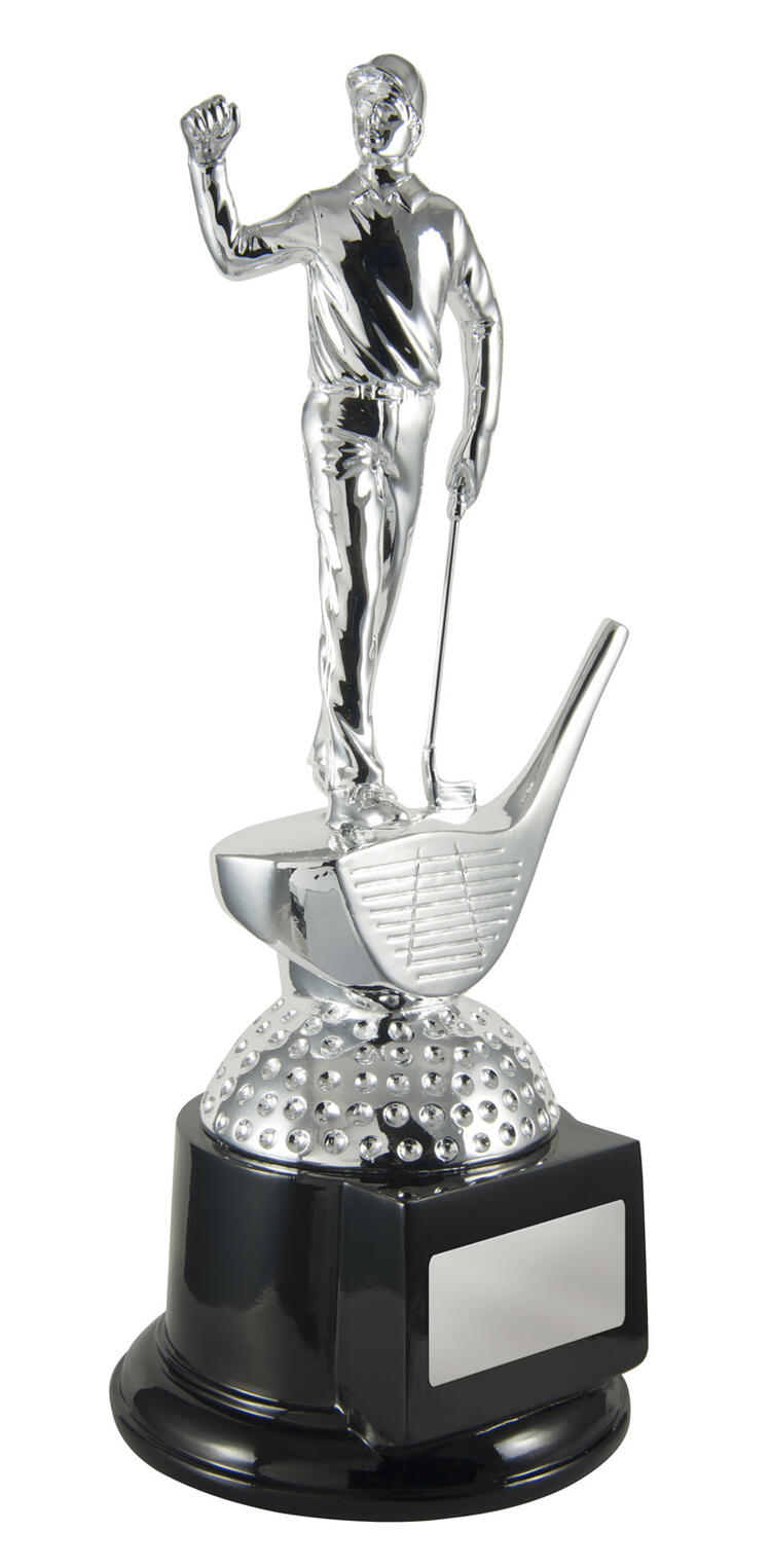 This golf trophy from The Birdie Series combines contemporary design with traditional prestige. Featuring a gold golfer figure poised atop a detailed golf ball and club head, it stands confidently on a black base. Its silver and black palette, quality materials, and professional finish make it a memorable symbol of achievement for any golf event.