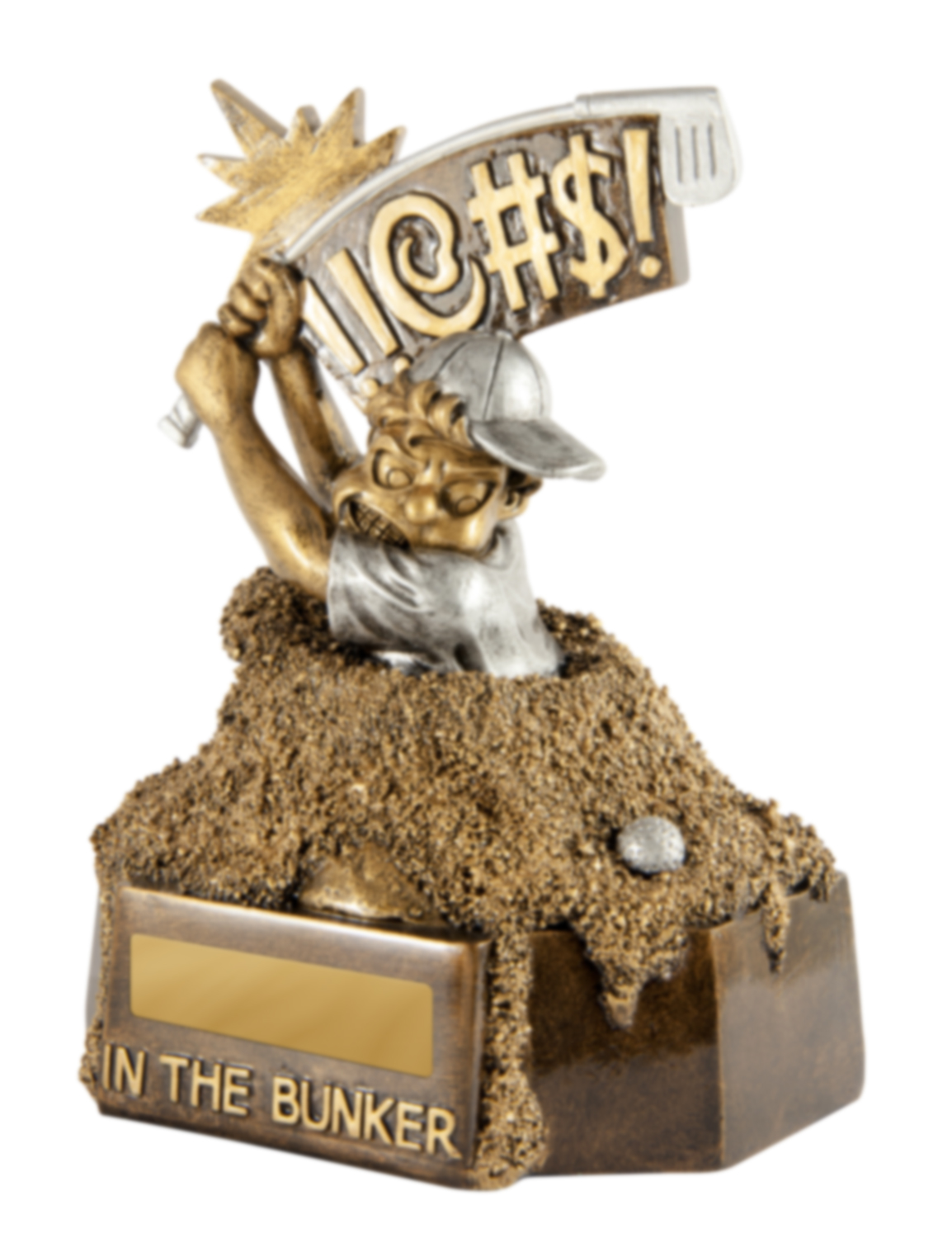 This funny golf trophy combines skilled craftsmanship with light hearted humour, making it a memorable choice for recognising achievement on the golf course. Featuring a detailed figurine of a golfer navigating a bunker, the trophy blends antique silver, gold, and brown finishes for a refined appearance. Crafted from resin, it includes a blank plaque for custom personalisation.