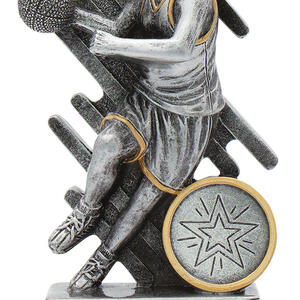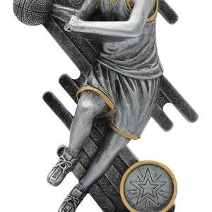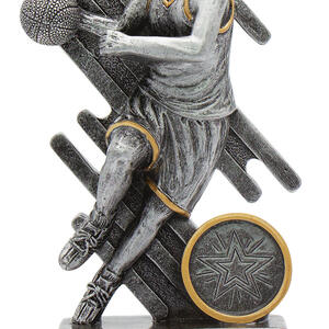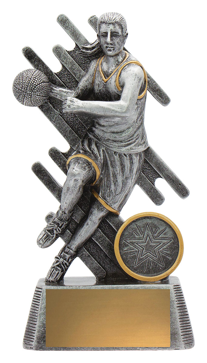 Celebrate standout performances with this sophisticated trophy, crafted to honour achievement in womenÂ’s basketball. The metallic silver and gold finish, paired with a dynamic basketball player figurine and star emblem, creates a striking and memorable tribute. This award is an elegant and durable addition to any collection of basketball trophies, designed to inspire and recognise excellence.