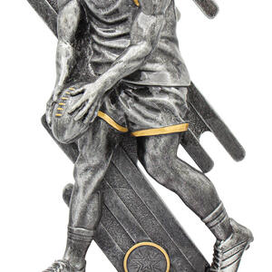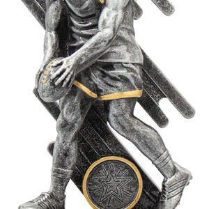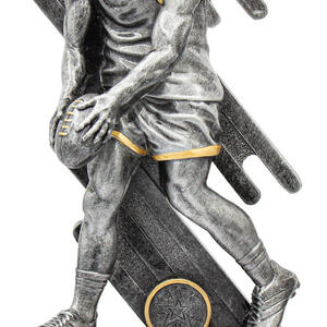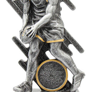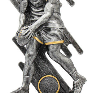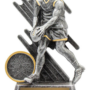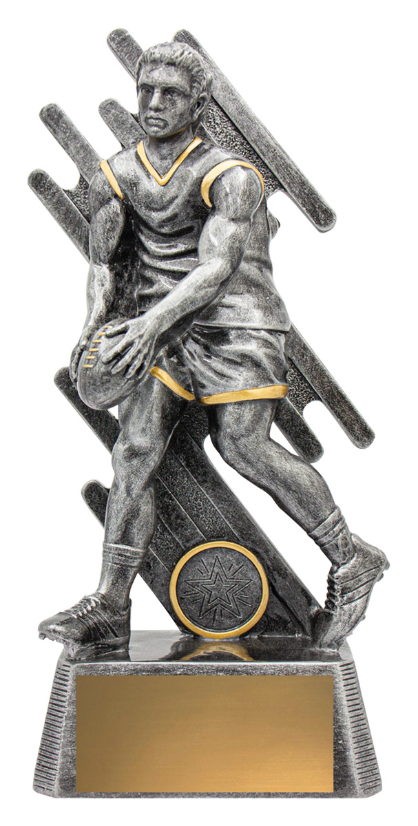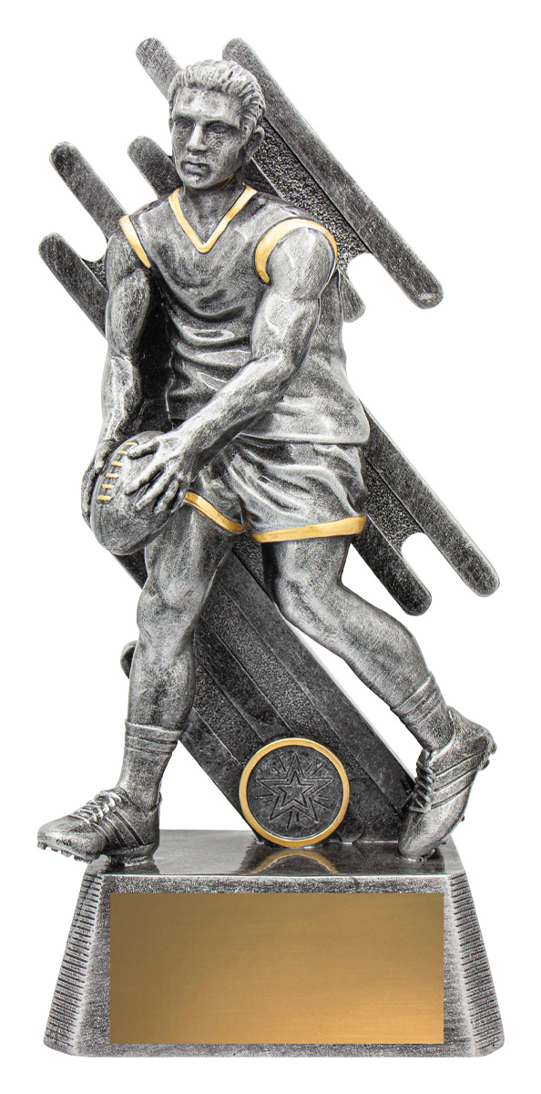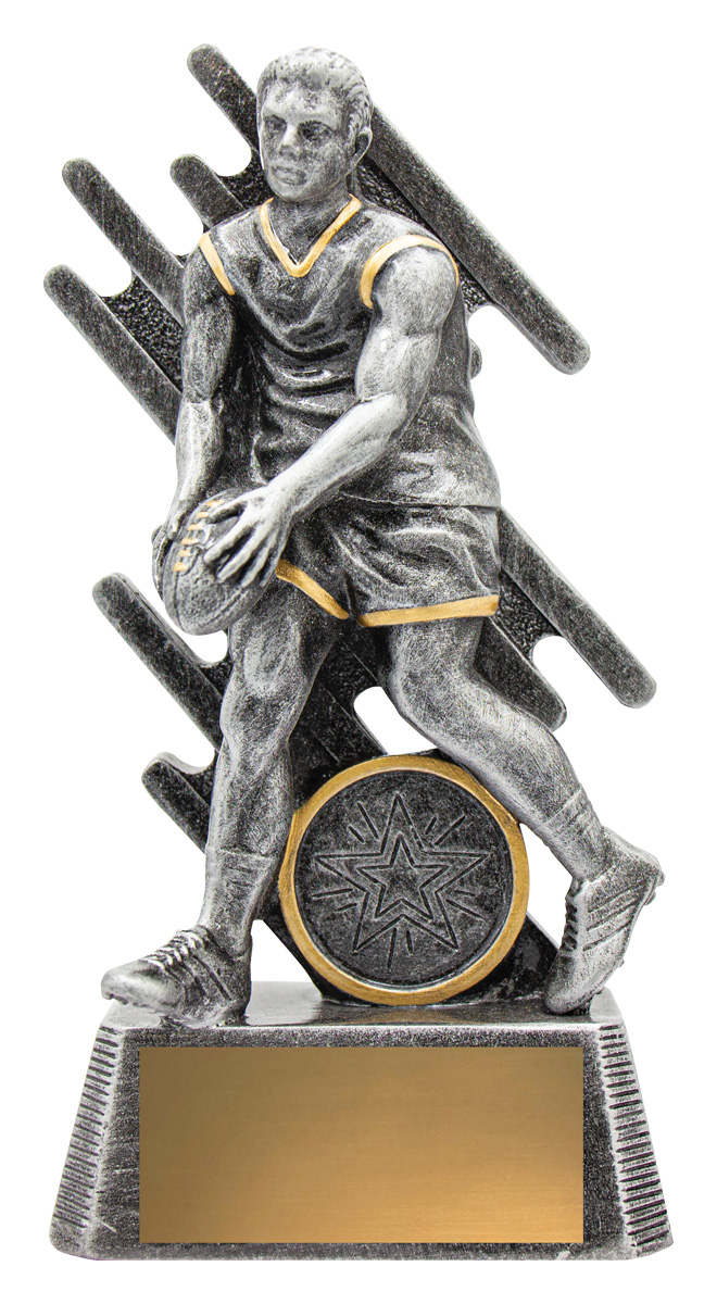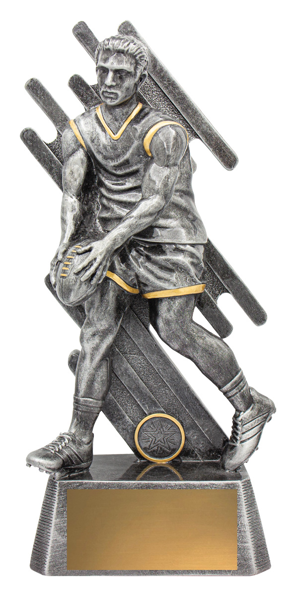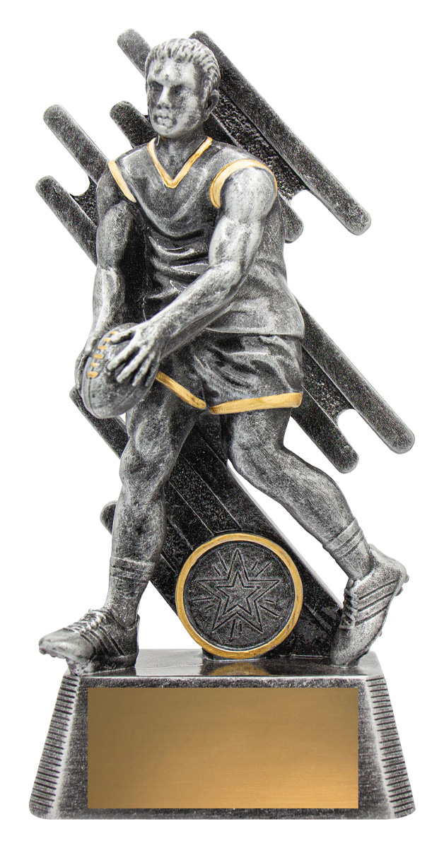 Celebrate the skill and spirit of Aussie Rules with this expertly crafted aussie rules trophy. Featuring a dynamic male player in mid action and highlighted with antique silver and gold finishes, this award is both elegant and durable. The detailed design, star emblem, and range of available sizes make it a memorable choice for recognising achievement in the game.