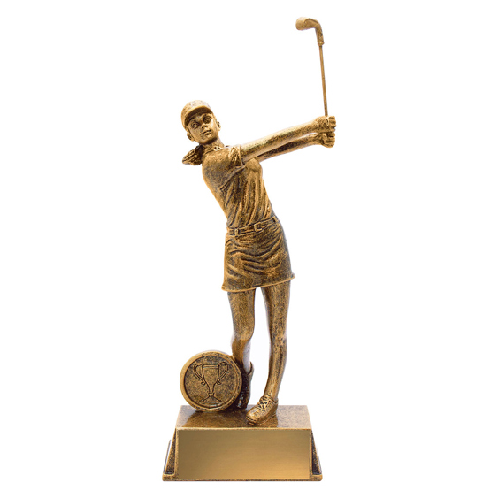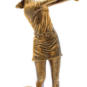 This detailed gold resin trophy captures a female golfer mid-swing with realistic motion and texture. A timeless award option for ladies golf competitions, tournaments, or club presentations.