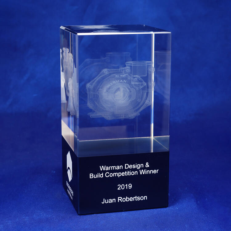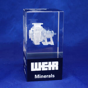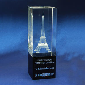 A premium 3D laser engraved crystal award featuring an intricate internal design within a solid clear crystal block.