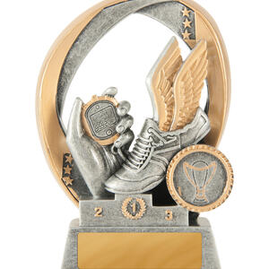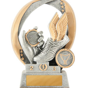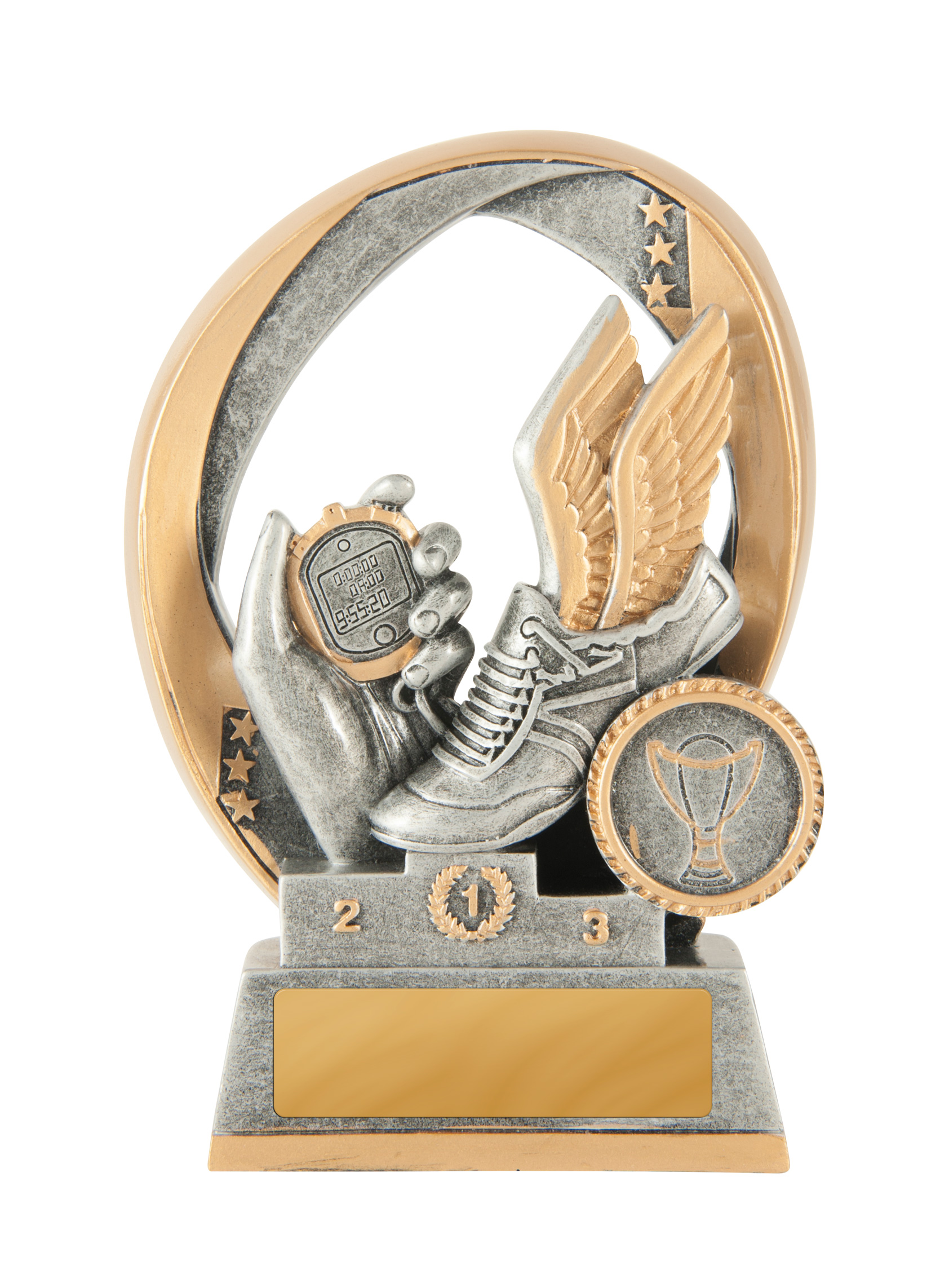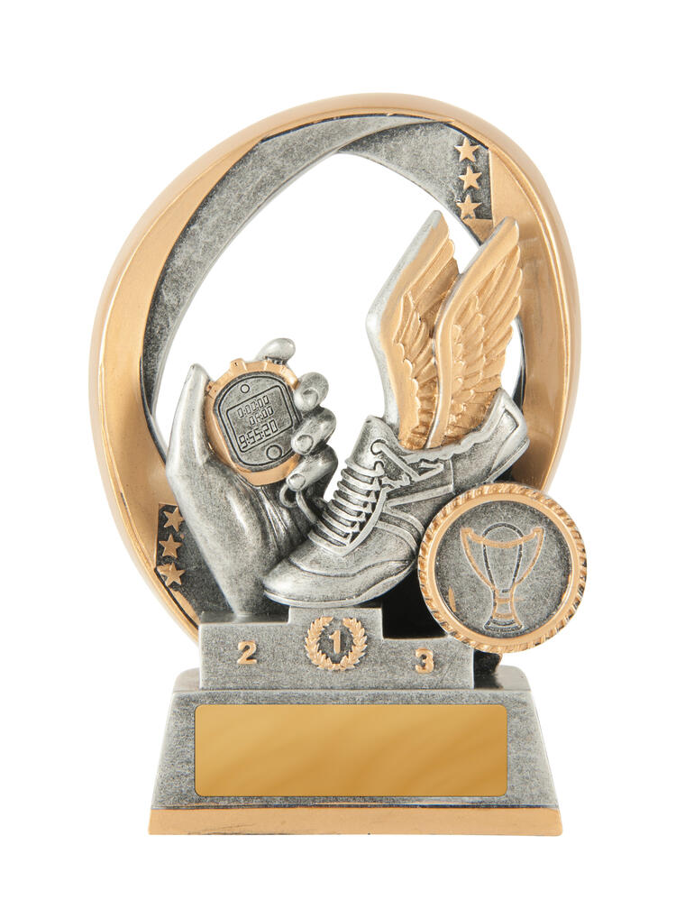 Crafted for distinction, this elliptical athletics trophy features a robust design with a deeply recessed, finely textured background. The 3D elements, stopwatch, winged shoe, and trophy symbol capture the spirit of achievement in athletics awards. Available in gold, silver, or bronze finishes, it includes a quality neckband and accepts an optional custom engraved tag on the reverse.