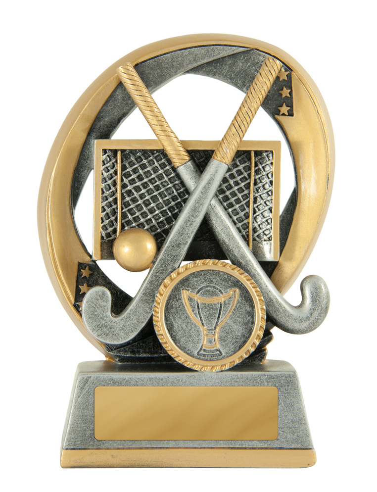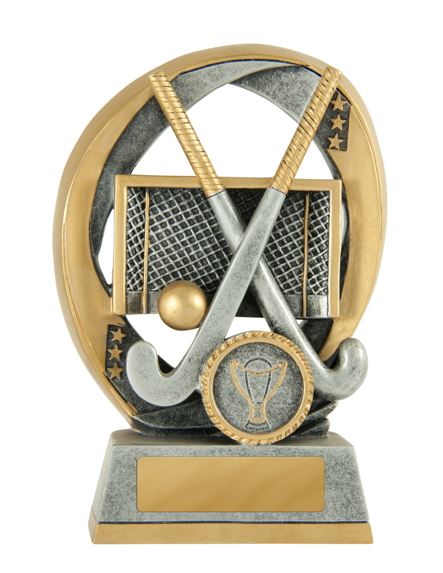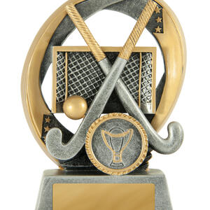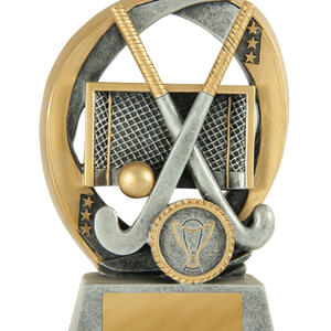 Celebrate hockey achievement with this elliptical hockey trophy, crafted to recognise dedication on and off the pitch. A circular base supports a dynamic arrangement of crossed hockey sticks, a hockey ball, and a detailed goal net, brought together in an elegant combination of gold and silver tones.