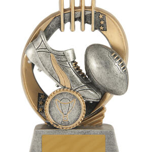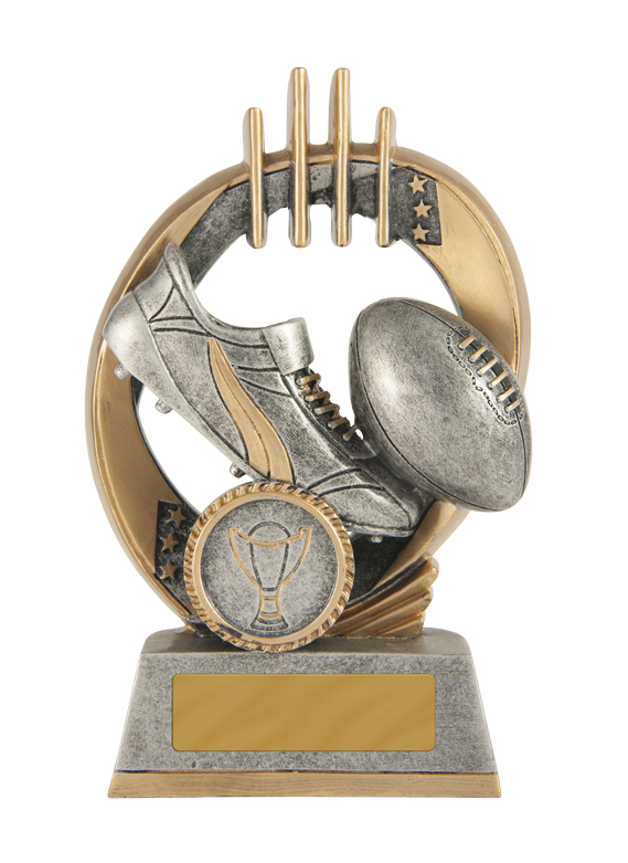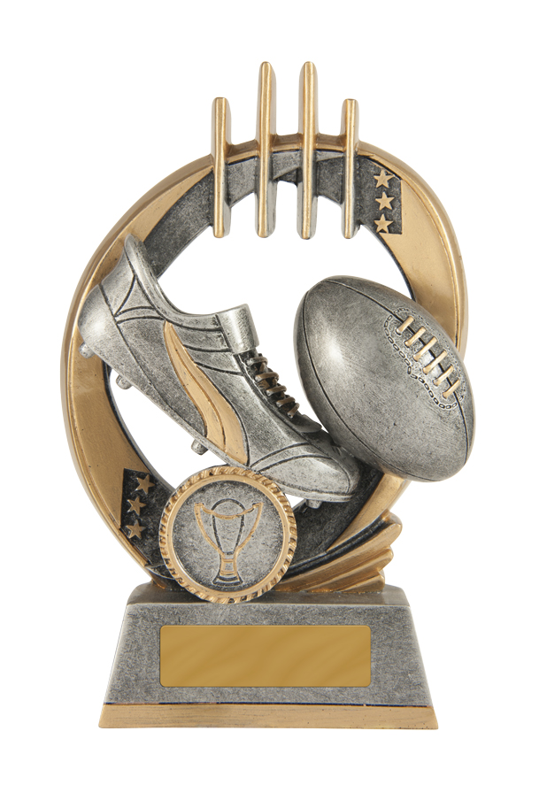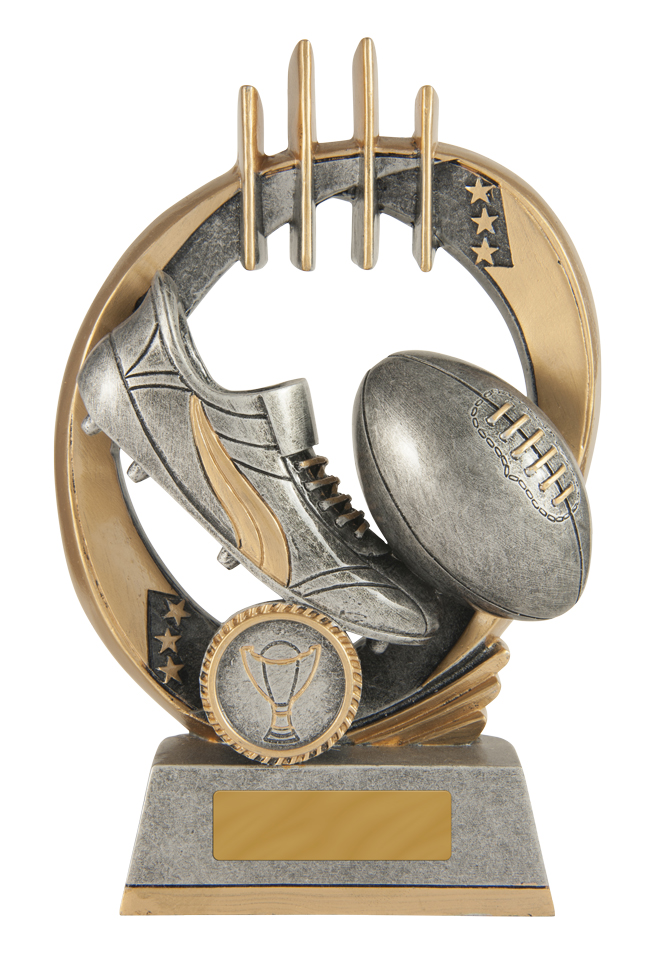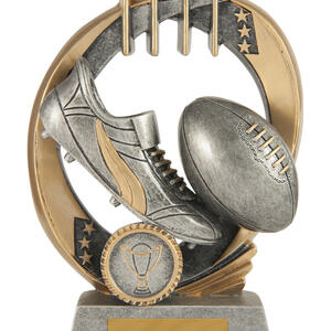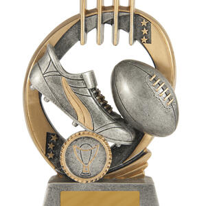 This elliptical aussie rules trophy blends contemporary design with traditional sporting elements, making it a standout choice for recognising football achievement. Crafted from quality resin in antique silver and gold, it features dynamic multi star accents, a football, and a boot set against an elegant elliptical backdrop.