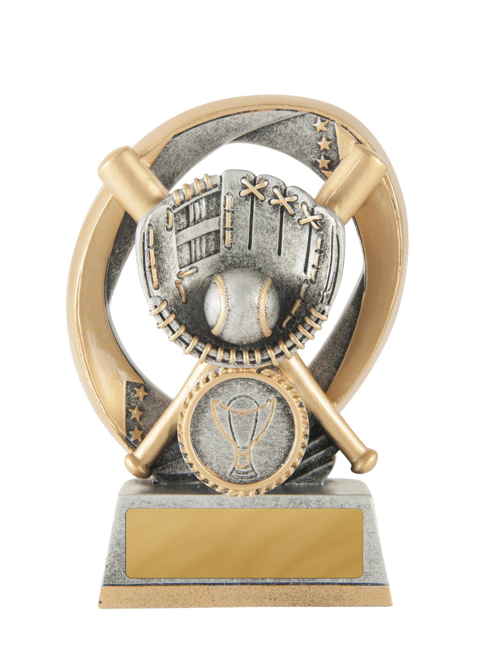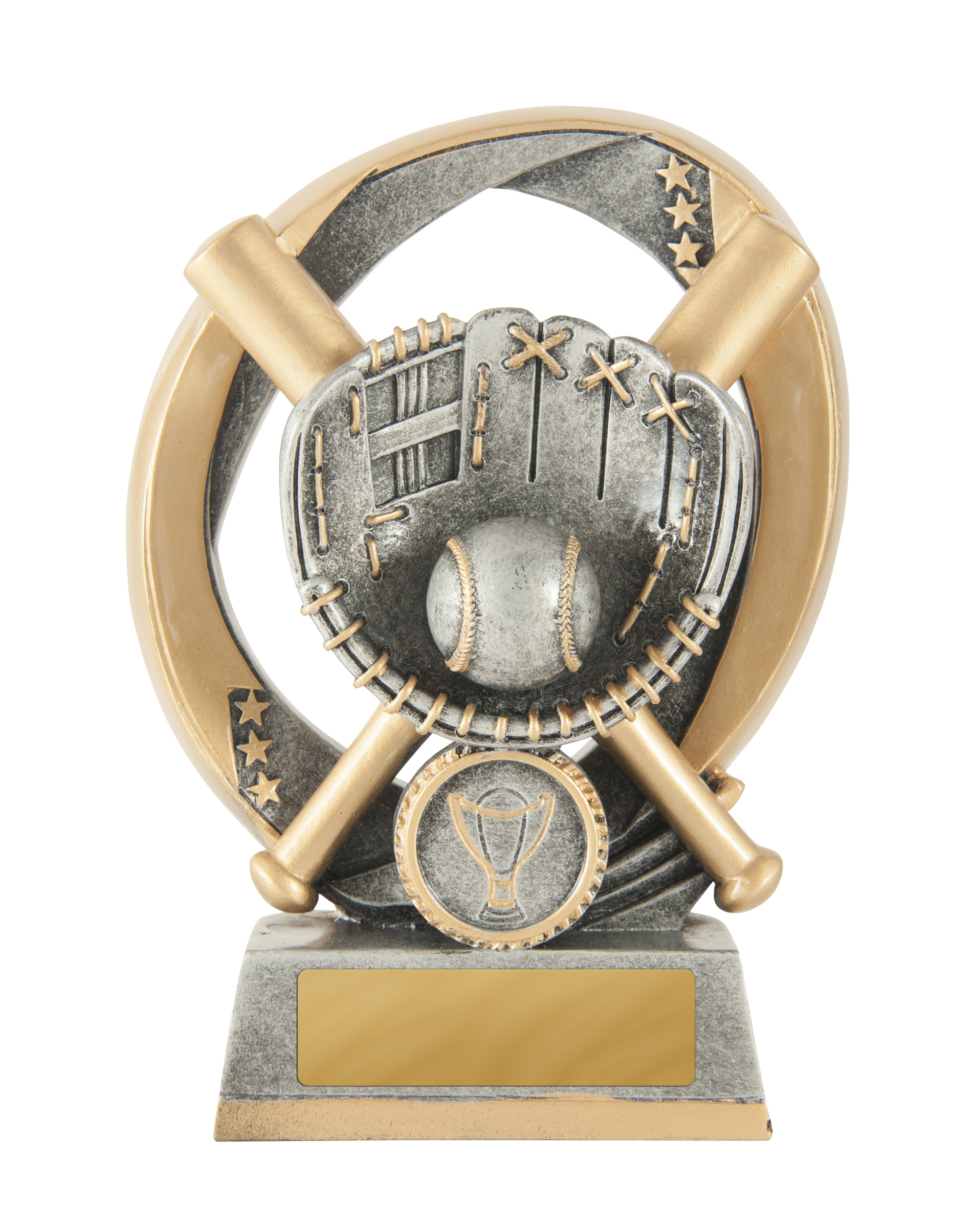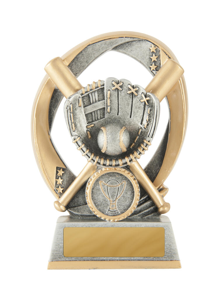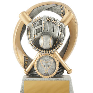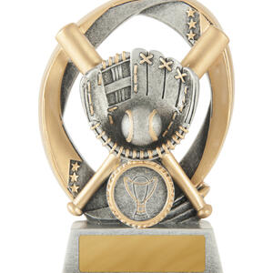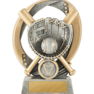 Striking a balance between modern artistry and athletic tradition, this baseball trophy is crafted from resin. The gold and silver flame grill design, featuring a baseball glove, ball, and bats, creates a memorable tribute to sporting achievement. Its circular base and height make it an ideal softball award for standout players and teams.