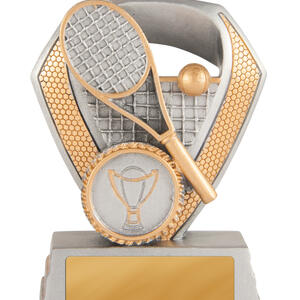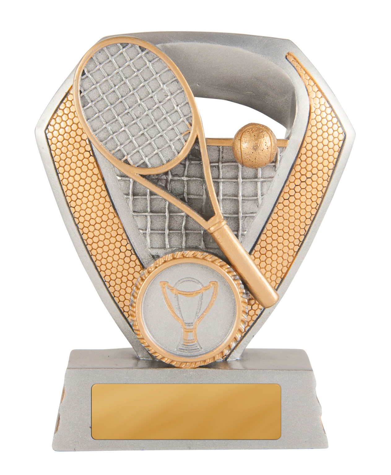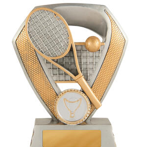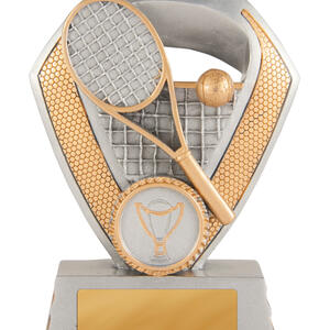 Crafted for distinction, this trophy features silver and gold tennis racket, ball and player motif. Shield-Tennis is part of our tennis trophies range and offers a complimentary engraved plate for personalised recognition.