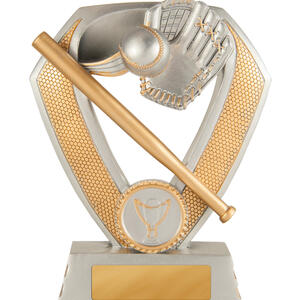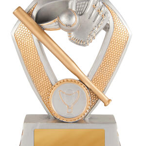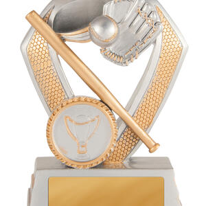 This robust trophy stands out among baseball trophies and is equally suited as a softball trophy, crafted from resin. Its striking 3D relief features a baseball bat, ball, and glove, set against a finely textured background.