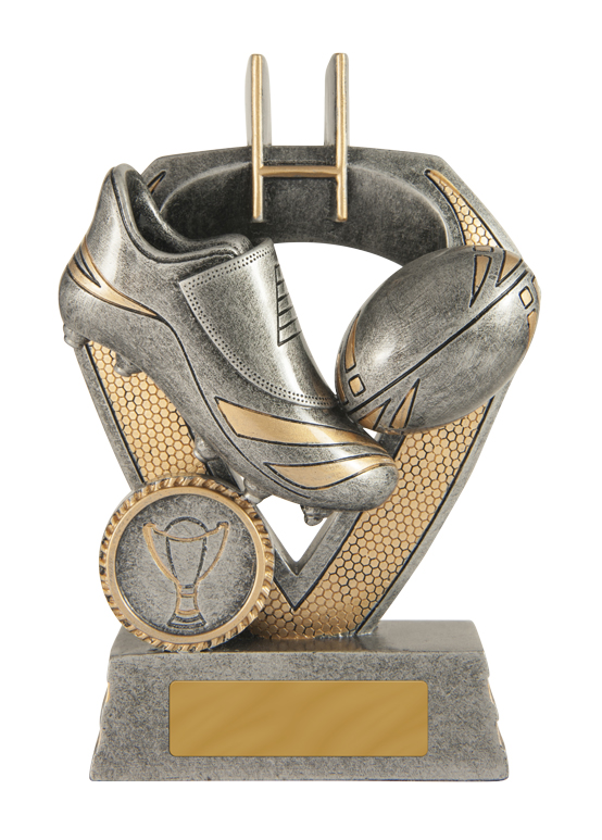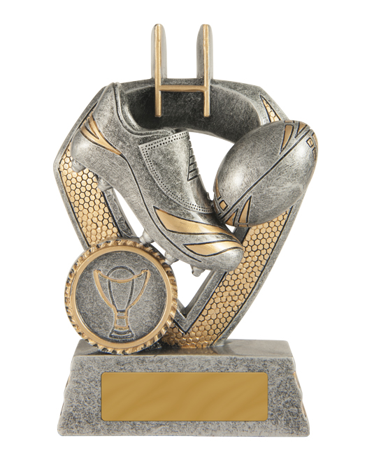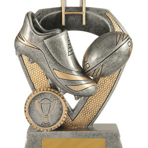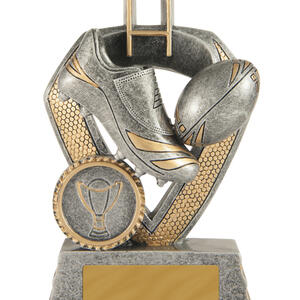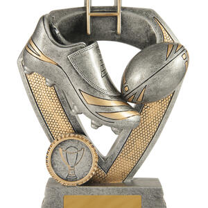 This rugby trophy from the Shield Series celebrates the spirit of the game with an antique silver finish and striking gold accents. Its shield design features a rugby boot, ball, and goalposts, highlighting dedication and achievement on the field.