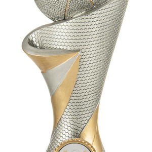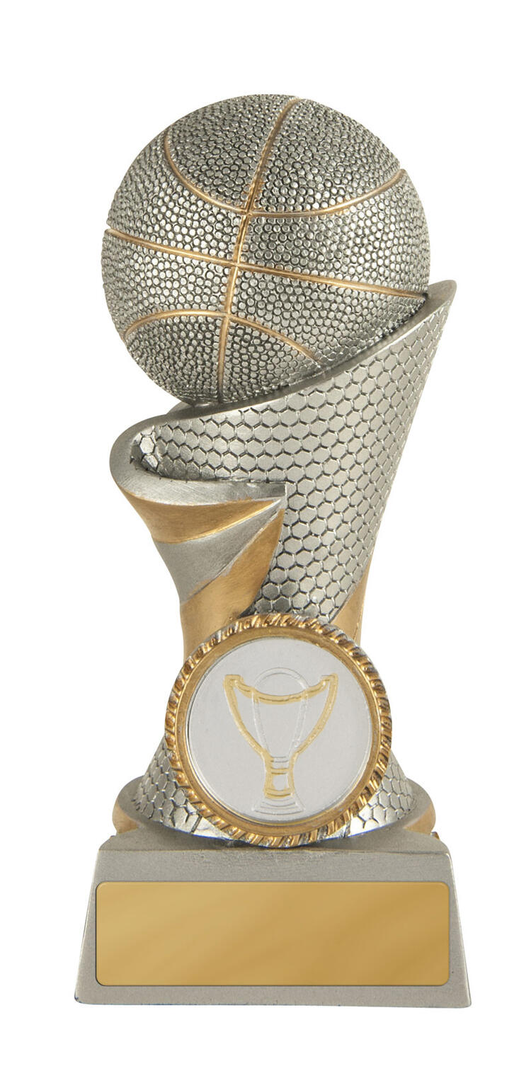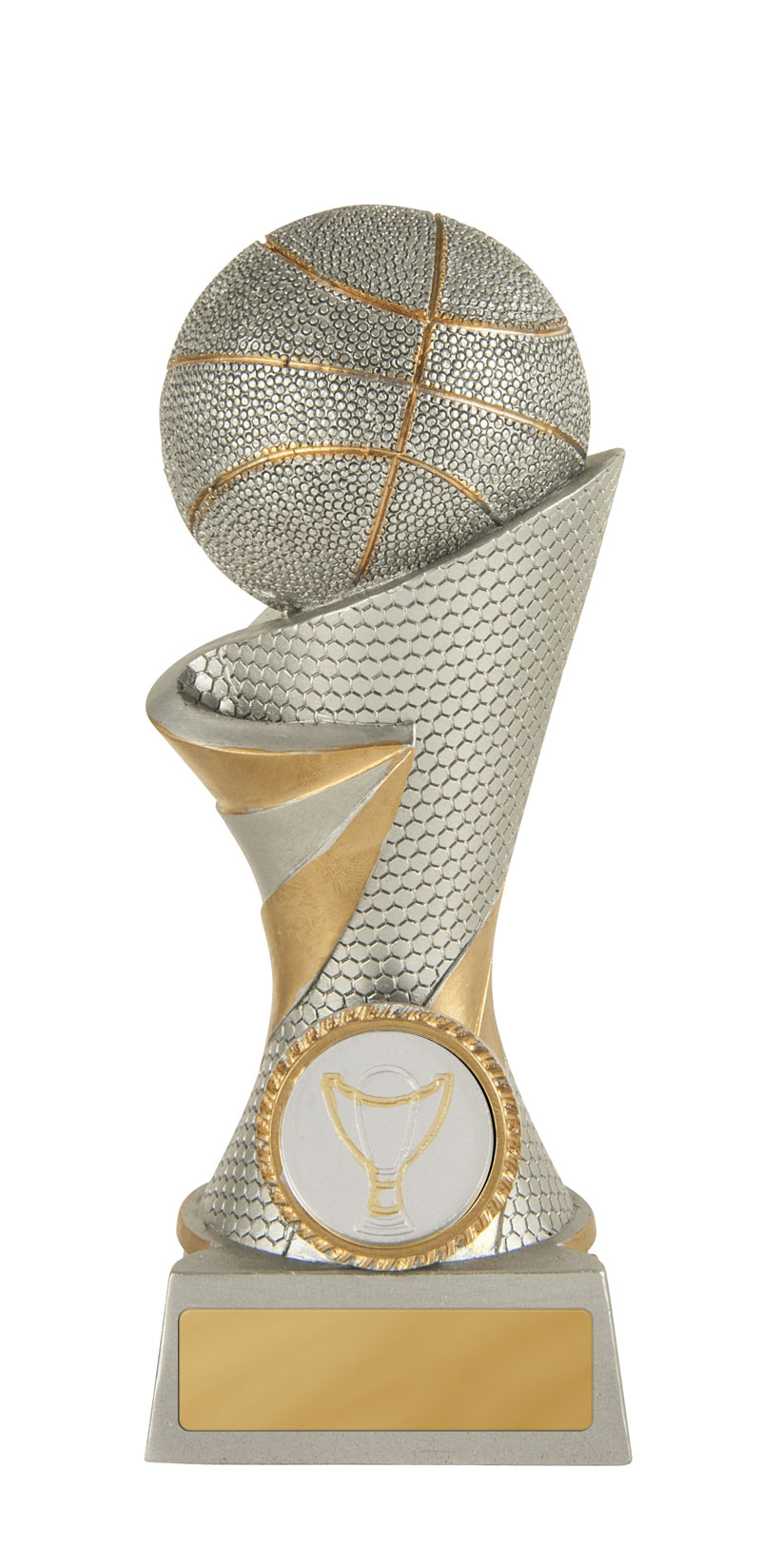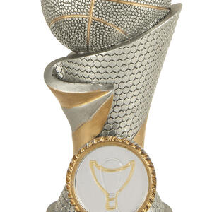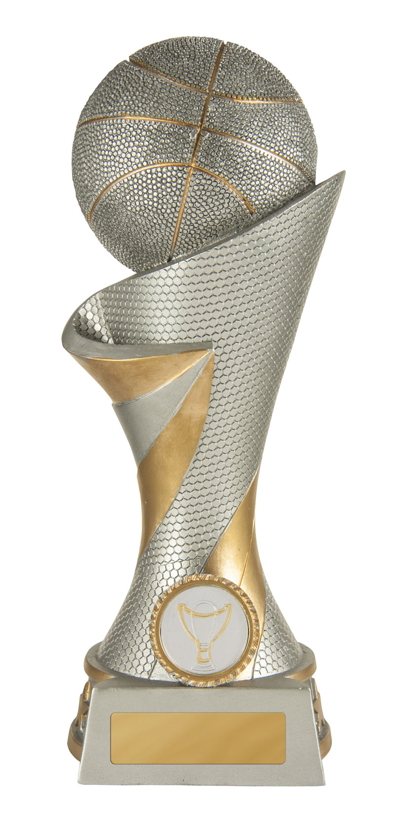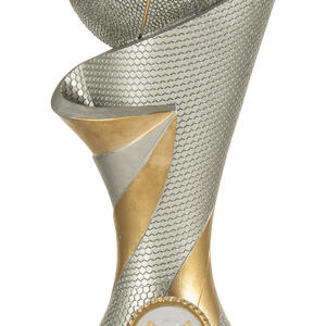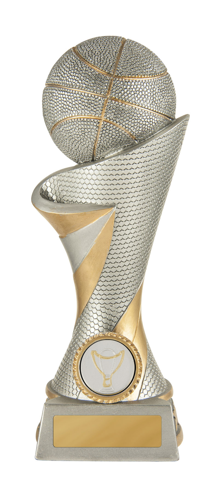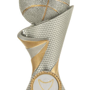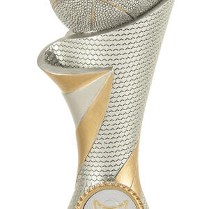 Distinguished by its contemporary tower design, this basketball trophy is crafted in gleaming silver and gold tones with a realistic, textured basketball perched on top. Finished with a black wood base, it offers a premium recognition experience with custom personalisation included.
