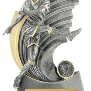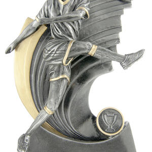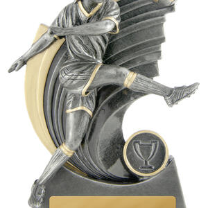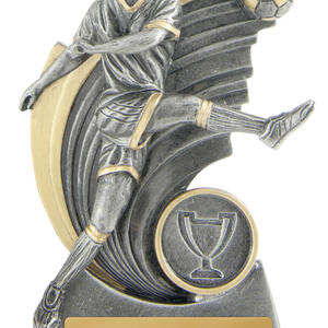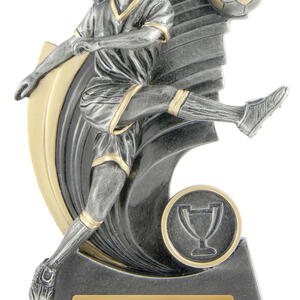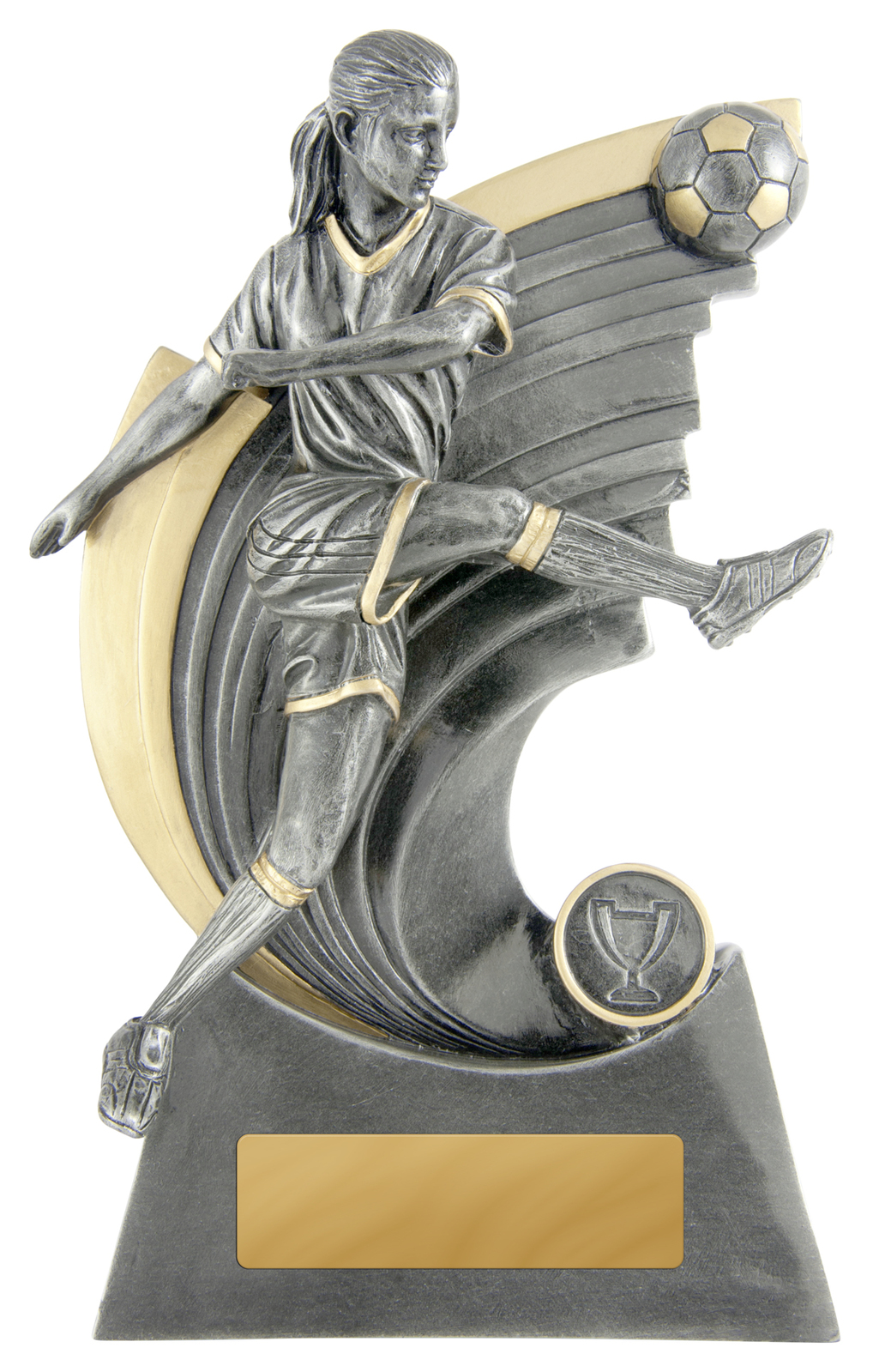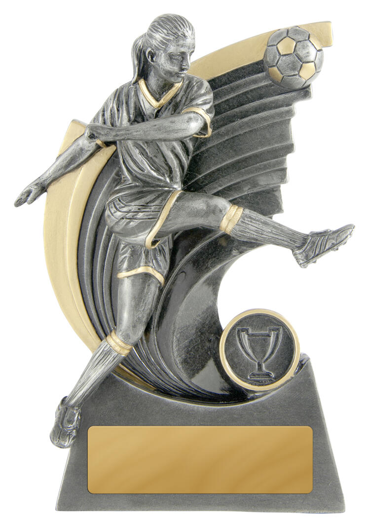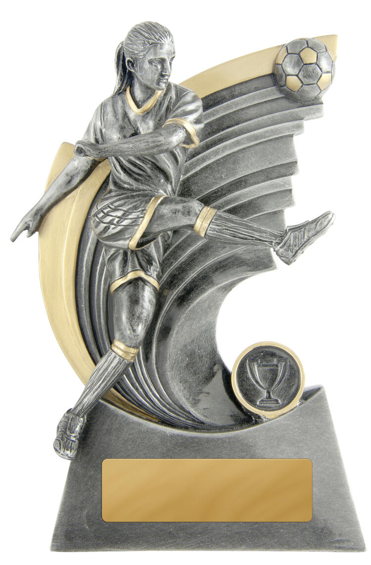 Crafted for standout recognition in women's football, this gold finished soccer trophy features a dynamic female player in motion atop a solid rectangular base. The design is highlighted by a football and trophy emblem, incorporating a striking lightning bolt motif for added impact.