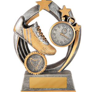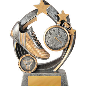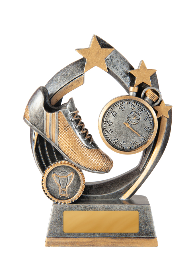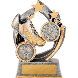 Crafted for those who value achievement, this Atomic Series trophy is tailored to athletics awards and recognition. Showcasing a bold mix of gold and silver finishes, it features a stopwatch, a running shoe, and a trophy emblem symbols of effort and victory. Its dynamic ribbon detail and star shaped elements create a memorable, professional presentation.