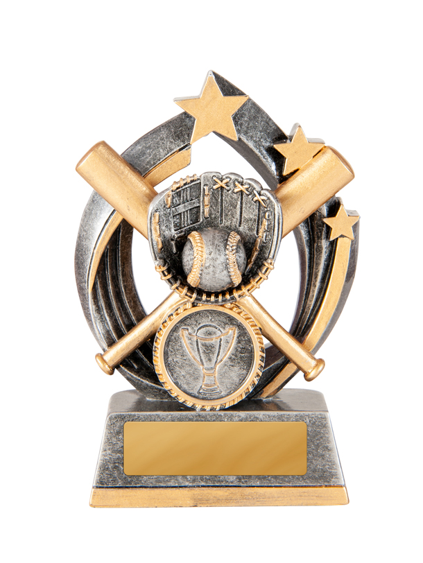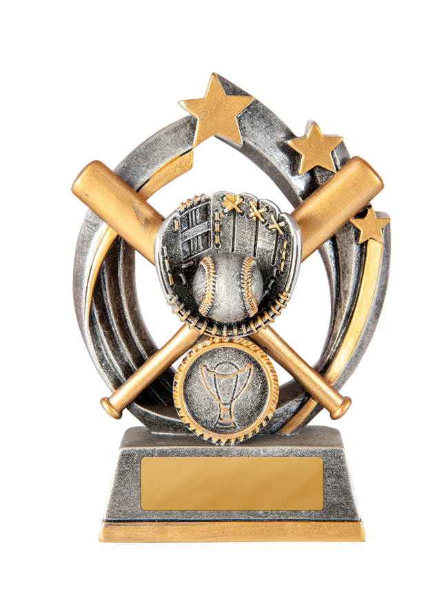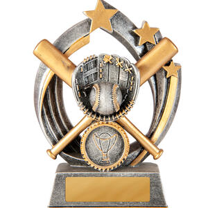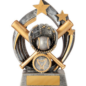 A refined choice for recognising excellence, this baseball trophy or softball trophy showcases a striking gold and silver palette. Crafted from resin, it features a circular base with crossed bats, a baseball glove and golden ball surrounded by stars, and a distinguished trophy emblem.
