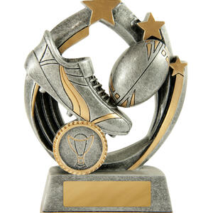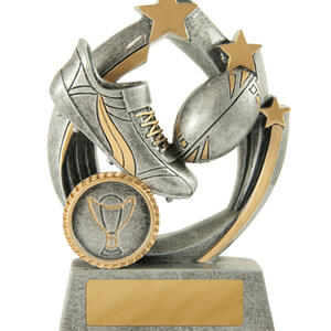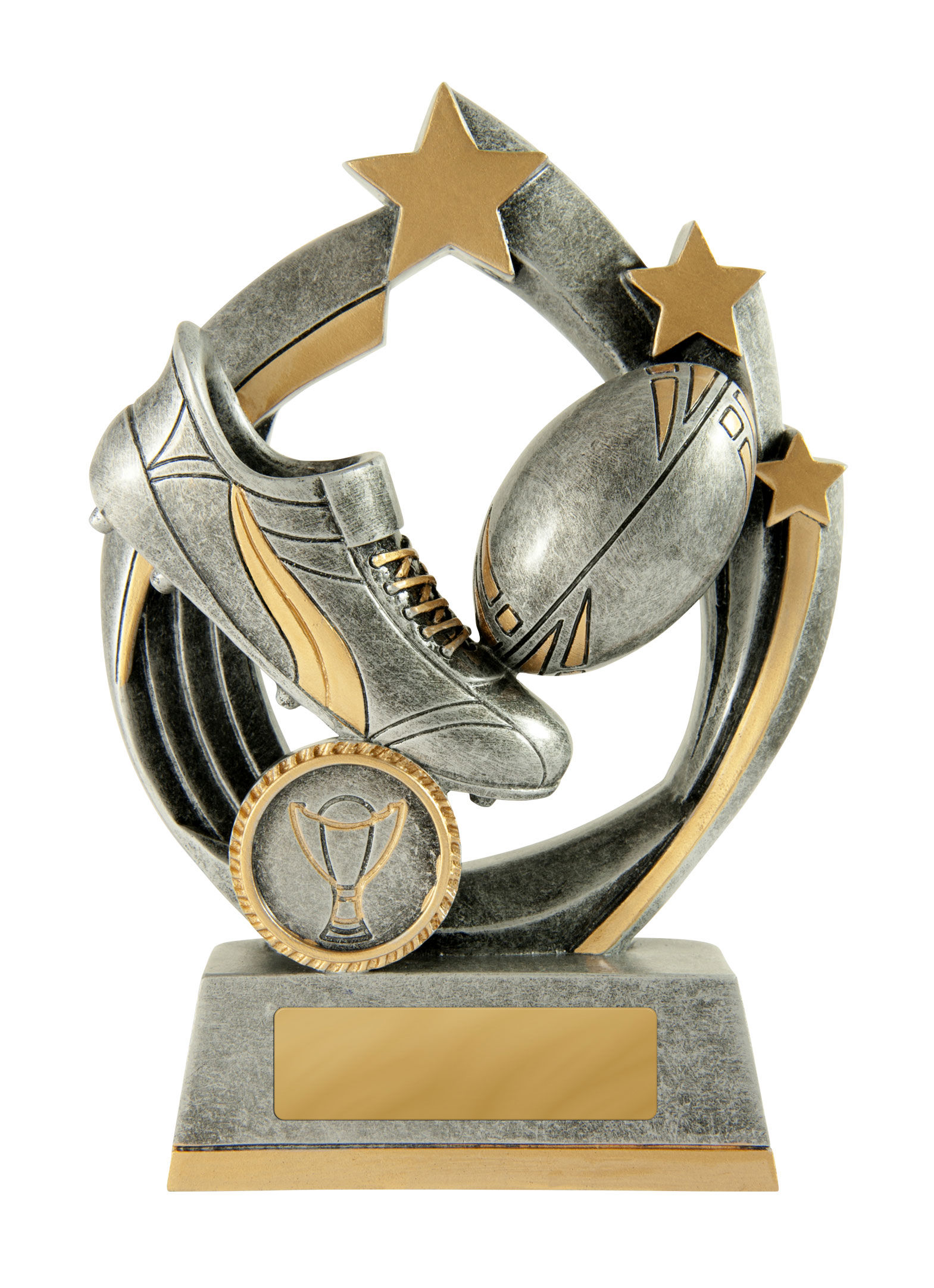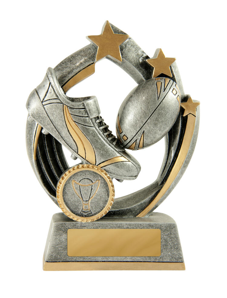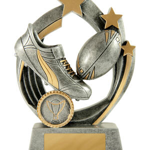 Crafted with precision, this Atomic Series trophy honours achievement in rugby league and rugby union. The award features a dynamic rugby ball and boot design, set against a backdrop of star accents in antique silver and gold tones.