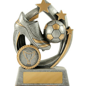 Celebrate football achievement with a trophy crafted to inspire. This football trophy features a striking football and boot motif in gold and silver, set atop a sturdy black marble base. Durable metallised plastic and a gold accented personalisation plate, make this soccer trophy an elegant and memorable choice for player or team recognition.